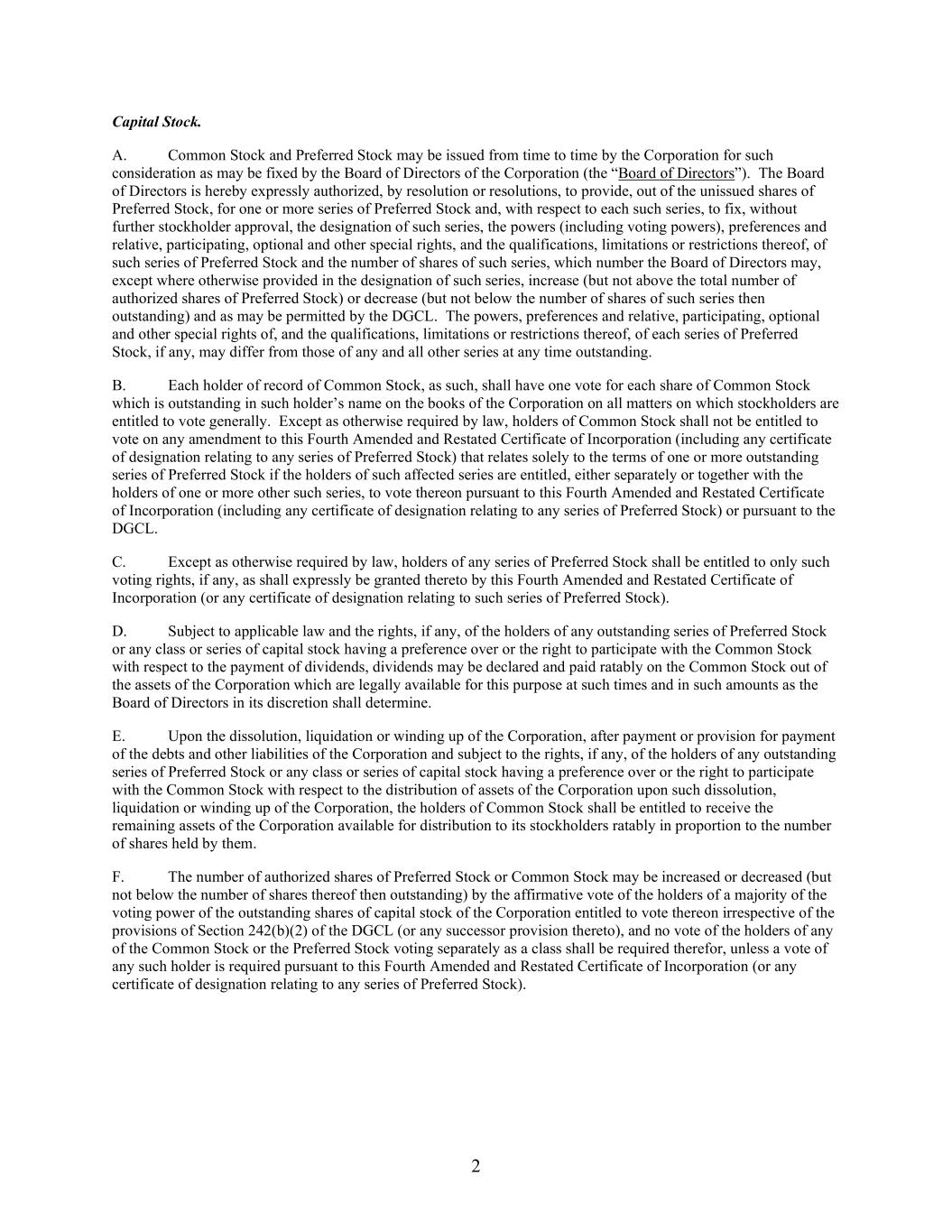 2 Capital Stock. A. Common Stock and Preferred Stock may be issued from time to time by the Corporation for such consideration as may be fixed by the Board of Directors of the Corporation (the “Board of Directors”). The Board of Directors is hereby expressly authorized, by resolution or resolutions, to provide, out of the unissued shares of Preferred Stock, for one or more series of Preferred Stock and, with respect to each such series, to fix, without further stockholder approval, the designation of such series, the powers (including voting powers), preferences and relative, participating, optional and other special rights, and the qualifications, limitations or restrictions thereof, of such series of Preferred Stock and the number of shares of such series, which number the Board of Directors may, except where otherwise provided in the designation of such series, increase (but not above the total number of authorized shares of Preferred Stock) or decrease (but not below the number of shares of such series then outstanding) and as may be permitted by the DGCL. The powers, preferences and relative, participating, optional and other special rights of, and the qualifications, limitations or restrictions thereof, of each series of Preferred Stock, if any, may differ from those of any and all other series at any time outstanding. B. Each holder of record of Common Stock, as such, shall have one vote for each share of Common Stock which is outstanding in such holder’s name on the books of the Corporation on all matters on which stockholders are entitled to vote generally. Except as otherwise required by law, holders of Common Stock shall not be entitled to vote on any amendment to this Fourth Amended and Restated Certificate of Incorporation (including any certificate of designation relating to any series of Preferred Stock) that relates solely to the terms of one or more outstanding series of Preferred Stock if the holders of such affected series are entitled, either separately or together with the holders of one or more other such series, to vote thereon pursuant to this Fourth Amended and Restated Certificate of Incorporation (including any certificate of designation relating to any series of Preferred Stock) or pursuant to the DGCL. C. Except as otherwise required by law, holders of any series of Preferred Stock shall be entitled to only such voting rights, if any, as shall expressly be granted thereto by this Fourth Amended and Restated Certificate of Incorporation (or any certificate of designation relating to such series of Preferred Stock). D. Subject to applicable law and the rights, if any, of the holders of any outstanding series of Preferred Stock or any class or series of capital stock having a preference over or the right to participate with the Common Stock with respect to the payment of dividends, dividends may be declared and paid ratably on the Common Stock out of the assets of the Corporation which are legally available for this purpose at such times and in such amounts as the Board of Directors in its discretion shall determine. E. Upon the dissolution, liquidation or winding up of the Corporation, after payment or provision for payment of the debts and other liabilities of the Corporation and subject to the rights, if any, of the holders of any outstanding series of Preferred Stock or any class or series of capital stock having a preference over or the right to participate with the Common Stock with respect to the distribution of assets of the Corporation upon such dissolution, liquidation or winding up of the Corporation, the holders of Common Stock shall be entitled to receive the remaining assets of the Corporation available for distribution to its stockholders ratably in proportion to the number of shares held by them. F. The number of authorized shares of Preferred Stock or Common Stock may be increased or decreased (but not below the number of shares thereof then outstanding) by the affirmative vote of the holders of a majority of the voting power of the outstanding shares of capital stock of the Corporation entitled to vote thereon irrespective of the provisions of Section 242(b)(2) of the DGCL (or any successor provision thereto), and no vote of the holders of any of the Common Stock or the Preferred Stock voting separately as a class shall be required therefor, unless a vote of any such holder is required pursuant to this Fourth Amended and Restated Certificate of Incorporation (or any certificate of designation relating to any series of Preferred Stock).