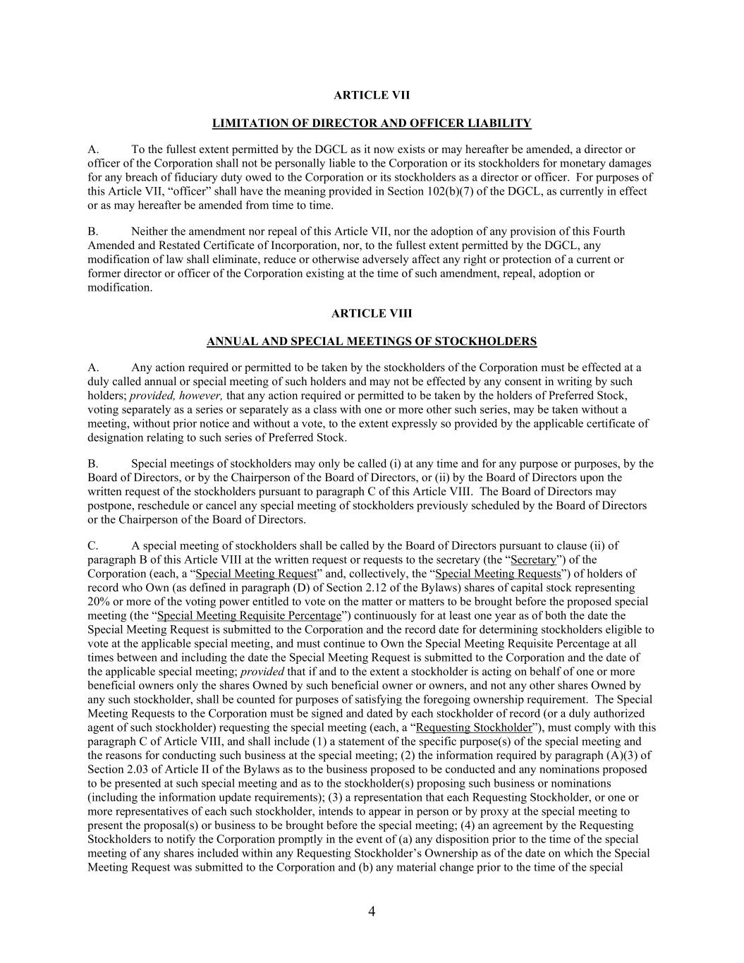 4 ARTICLE VII LIMITATION OF DIRECTOR AND OFFICER LIABILITY A. To the fullest extent permitted by the DGCL as it now exists or may hereafter be amended, a director or officer of the Corporation shall not be personally liable to the Corporation or its stockholders for monetary damages for any breach of fiduciary duty owed to the Corporation or its stockholders as a director or officer. For purposes of this Article VII, “officer” shall have the meaning provided in Section 102(b)(7) of the DGCL, as currently in effect or as may hereafter be amended from time to time. B. Neither the amendment nor repeal of this Article VII, nor the adoption of any provision of this Fourth Amended and Restated Certificate of Incorporation, nor, to the fullest extent permitted by the DGCL, any modification of law shall eliminate, reduce or otherwise adversely affect any right or protection of a current or former director or officer of the Corporation existing at the time of such amendment, repeal, adoption or modification. ARTICLE VIII ANNUAL AND SPECIAL MEETINGS OF STOCKHOLDERS A. Any action required or permitted to be taken by the stockholders of the Corporation must be effected at a duly called annual or special meeting of such holders and may not be effected by any consent in writing by such holders; provided, however, that any action required or permitted to be taken by the holders of Preferred Stock, voting separately as a series or separately as a class with one or more other such series, may be taken without a meeting, without prior notice and without a vote, to the extent expressly so provided by the applicable certificate of designation relating to such series of Preferred Stock. B. Special meetings of stockholders may only be called (i) at any time and for any purpose or purposes, by the Board of Directors, or by the Chairperson of the Board of Directors, or (ii) by the Board of Directors upon the written request of the stockholders pursuant to paragraph C of this Article VIII. The Board of Directors may postpone, reschedule or cancel any special meeting of stockholders previously scheduled by the Board of Directors or the Chairperson of the Board of Directors. C. A special meeting of stockholders shall be called by the Board of Directors pursuant to clause (ii) of paragraph B of this Article VIII at the written request or requests to the secretary (the “Secretary”) of the Corporation (each, a “Special Meeting Request” and, collectively, the “Special Meeting Requests”) of holders of record who Own (as defined in paragraph (D) of Section 2.12 of the Bylaws) shares of capital stock representing 20% or more of the voting power entitled to vote on the matter or matters to be brought before the proposed special meeting (the “Special Meeting Requisite Percentage”) continuously for at least one year as of both the date the Special Meeting Request is submitted to the Corporation and the record date for determining stockholders eligible to vote at the applicable special meeting, and must continue to Own the Special Meeting Requisite Percentage at all times between and including the date the Special Meeting Request is submitted to the Corporation and the date of the applicable special meeting; provided that if and to the extent a stockholder is acting on behalf of one or more beneficial owners only the shares Owned by such beneficial owner or owners, and not any other shares Owned by any such stockholder, shall be counted for purposes of satisfying the foregoing ownership requirement. The Special Meeting Requests to the Corporation must be signed and dated by each stockholder of record (or a duly authorized agent of such stockholder) requesting the special meeting (each, a “Requesting Stockholder”), must comply with this paragraph C of Article VIII, and shall include (1) a statement of the specific purpose(s) of the special meeting and the reasons for conducting such business at the special meeting; (2) the information required by paragraph (A)(3) of Section 2.03 of Article II of the Bylaws as to the business proposed to be conducted and any nominations proposed to be presented at such special meeting and as to the stockholder(s) proposing such business or nominations (including the information update requirements); (3) a representation that each Requesting Stockholder, or one or more representatives of each such stockholder, intends to appear in person or by proxy at the special meeting to present the proposal(s) or business to be brought before the special meeting; (4) an agreement by the Requesting Stockholders to notify the Corporation promptly in the event of (a) any disposition prior to the time of the special meeting of any shares included within any Requesting Stockholder’s Ownership as of the date on which the Special Meeting Request was submitted to the Corporation and (b) any material change prior to the time of the special