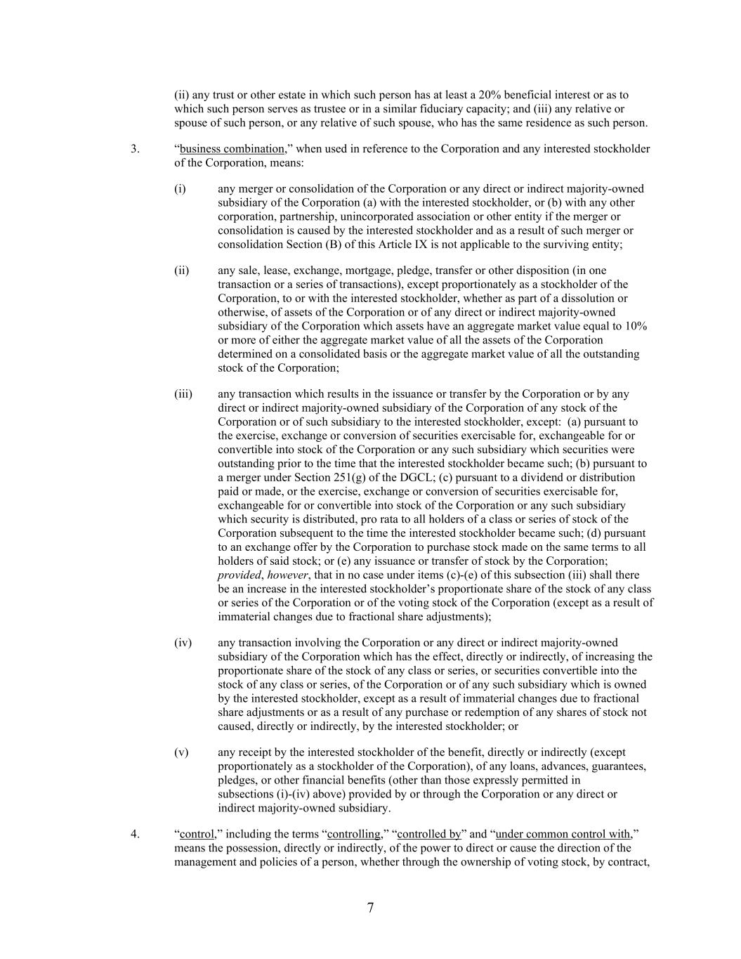 7 (ii) any trust or other estate in which such person has at least a 20% beneficial interest or as to which such person serves as trustee or in a similar fiduciary capacity; and (iii) any relative or spouse of such person, or any relative of such spouse, who has the same residence as such person. 3. “business combination,” when used in reference to the Corporation and any interested stockholder of the Corporation, means: (i) any merger or consolidation of the Corporation or any direct or indirect majority-owned subsidiary of the Corporation (a) with the interested stockholder, or (b) with any other corporation, partnership, unincorporated association or other entity if the merger or consolidation is caused by the interested stockholder and as a result of such merger or consolidation Section (B) of this Article IX is not applicable to the surviving entity; (ii) any sale, lease, exchange, mortgage, pledge, transfer or other disposition (in one transaction or a series of transactions), except proportionately as a stockholder of the Corporation, to or with the interested stockholder, whether as part of a dissolution or otherwise, of assets of the Corporation or of any direct or indirect majority-owned subsidiary of the Corporation which assets have an aggregate market value equal to 10% or more of either the aggregate market value of all the assets of the Corporation determined on a consolidated basis or the aggregate market value of all the outstanding stock of the Corporation; (iii) any transaction which results in the issuance or transfer by the Corporation or by any direct or indirect majority-owned subsidiary of the Corporation of any stock of the Corporation or of such subsidiary to the interested stockholder, except: (a) pursuant to the exercise, exchange or conversion of securities exercisable for, exchangeable for or convertible into stock of the Corporation or any such subsidiary which securities were outstanding prior to the time that the interested stockholder became such; (b) pursuant to a merger under Section 251(g) of the DGCL; (c) pursuant to a dividend or distribution paid or made, or the exercise, exchange or conversion of securities exercisable for, exchangeable for or convertible into stock of the Corporation or any such subsidiary which security is distributed, pro rata to all holders of a class or series of stock of the Corporation subsequent to the time the interested stockholder became such; (d) pursuant to an exchange offer by the Corporation to purchase stock made on the same terms to all holders of said stock; or (e) any issuance or transfer of stock by the Corporation; provided, however, that in no case under items (c)-(e) of this subsection (iii) shall there be an increase in the interested stockholder’s proportionate share of the stock of any class or series of the Corporation or of the voting stock of the Corporation (except as a result of immaterial changes due to fractional share adjustments); (iv) any transaction involving the Corporation or any direct or indirect majority-owned subsidiary of the Corporation which has the effect, directly or indirectly, of increasing the proportionate share of the stock of any class or series, or securities convertible into the stock of any class or series, of the Corporation or of any such subsidiary which is owned by the interested stockholder, except as a result of immaterial changes due to fractional share adjustments or as a result of any purchase or redemption of any shares of stock not caused, directly or indirectly, by the interested stockholder; or (v) any receipt by the interested stockholder of the benefit, directly or indirectly (except proportionately as a stockholder of the Corporation), of any loans, advances, guarantees, pledges, or other financial benefits (other than those expressly permitted in subsections (i)-(iv) above) provided by or through the Corporation or any direct or indirect majority-owned subsidiary. 4. “control,” including the terms “controlling,” “controlled by” and “under common control with,” means the possession, directly or indirectly, of the power to direct or cause the direction of the management and policies of a person, whether through the ownership of voting stock, by contract,