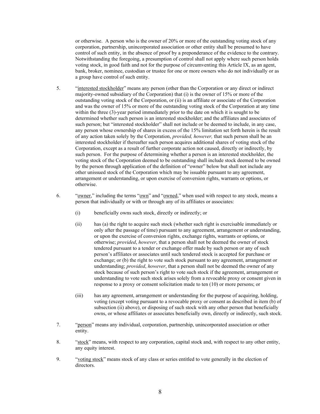 8 or otherwise. A person who is the owner of 20% or more of the outstanding voting stock of any corporation, partnership, unincorporated association or other entity shall be presumed to have control of such entity, in the absence of proof by a preponderance of the evidence to the contrary. Notwithstanding the foregoing, a presumption of control shall not apply where such person holds voting stock, in good faith and not for the purpose of circumventing this Article IX, as an agent, bank, broker, nominee, custodian or trustee for one or more owners who do not individually or as a group have control of such entity. 5. “interested stockholder” means any person (other than the Corporation or any direct or indirect majority-owned subsidiary of the Corporation) that (i) is the owner of 15% or more of the outstanding voting stock of the Corporation, or (ii) is an affiliate or associate of the Corporation and was the owner of 15% or more of the outstanding voting stock of the Corporation at any time within the three (3)-year period immediately prior to the date on which it is sought to be determined whether such person is an interested stockholder; and the affiliates and associates of such person; but “interested stockholder” shall not include or be deemed to include, in any case, any person whose ownership of shares in excess of the 15% limitation set forth herein is the result of any action taken solely by the Corporation, provided, however, that such person shall be an interested stockholder if thereafter such person acquires additional shares of voting stock of the Corporation, except as a result of further corporate action not caused, directly or indirectly, by such person. For the purpose of determining whether a person is an interested stockholder, the voting stock of the Corporation deemed to be outstanding shall include stock deemed to be owned by the person through application of the definition of “owner” below but shall not include any other unissued stock of the Corporation which may be issuable pursuant to any agreement, arrangement or understanding, or upon exercise of conversion rights, warrants or options, or otherwise. 6. “owner,” including the terms “own” and “owned,” when used with respect to any stock, means a person that individually or with or through any of its affiliates or associates: (i) beneficially owns such stock, directly or indirectly; or (ii) has (a) the right to acquire such stock (whether such right is exercisable immediately or only after the passage of time) pursuant to any agreement, arrangement or understanding, or upon the exercise of conversion rights, exchange rights, warrants or options, or otherwise; provided, however, that a person shall not be deemed the owner of stock tendered pursuant to a tender or exchange offer made by such person or any of such person’s affiliates or associates until such tendered stock is accepted for purchase or exchange; or (b) the right to vote such stock pursuant to any agreement, arrangement or understanding; provided, however, that a person shall not be deemed the owner of any stock because of such person’s right to vote such stock if the agreement, arrangement or understanding to vote such stock arises solely from a revocable proxy or consent given in response to a proxy or consent solicitation made to ten (10) or more persons; or (iii) has any agreement, arrangement or understanding for the purpose of acquiring, holding, voting (except voting pursuant to a revocable proxy or consent as described in item (b) of subsection (ii) above), or disposing of such stock with any other person that beneficially owns, or whose affiliates or associates beneficially own, directly or indirectly, such stock. 7. “person” means any individual, corporation, partnership, unincorporated association or other entity. 8. “stock” means, with respect to any corporation, capital stock and, with respect to any other entity, any equity interest. 9. “voting stock” means stock of any class or series entitled to vote generally in the election of directors.