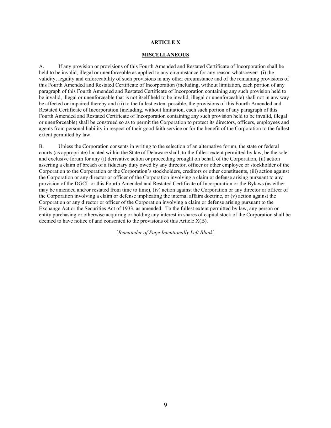 9 ARTICLE X MISCELLANEOUS A. If any provision or provisions of this Fourth Amended and Restated Certificate of Incorporation shall be held to be invalid, illegal or unenforceable as applied to any circumstance for any reason whatsoever: (i) the validity, legality and enforceability of such provisions in any other circumstance and of the remaining provisions of this Fourth Amended and Restated Certificate of Incorporation (including, without limitation, each portion of any paragraph of this Fourth Amended and Restated Certificate of Incorporation containing any such provision held to be invalid, illegal or unenforceable that is not itself held to be invalid, illegal or unenforceable) shall not in any way be affected or impaired thereby and (ii) to the fullest extent possible, the provisions of this Fourth Amended and Restated Certificate of Incorporation (including, without limitation, each such portion of any paragraph of this Fourth Amended and Restated Certificate of Incorporation containing any such provision held to be invalid, illegal or unenforceable) shall be construed so as to permit the Corporation to protect its directors, officers, employees and agents from personal liability in respect of their good faith service or for the benefit of the Corporation to the fullest extent permitted by law. B. Unless the Corporation consents in writing to the selection of an alternative forum, the state or federal courts (as appropriate) located within the State of Delaware shall, to the fullest extent permitted by law, be the sole and exclusive forum for any (i) derivative action or proceeding brought on behalf of the Corporation, (ii) action asserting a claim of breach of a fiduciary duty owed by any director, officer or other employee or stockholder of the Corporation to the Corporation or the Corporation’s stockholders, creditors or other constituents, (iii) action against the Corporation or any director or officer of the Corporation involving a claim or defense arising pursuant to any provision of the DGCL or this Fourth Amended and Restated Certificate of Incorporation or the Bylaws (as either may be amended and/or restated from time to time), (iv) action against the Corporation or any director or officer of the Corporation involving a claim or defense implicating the internal affairs doctrine, or (v) action against the Corporation or any director or officer of the Corporation involving a claim or defense arising pursuant to the Exchange Act or the Securities Act of 1933, as amended. To the fullest extent permitted by law, any person or entity purchasing or otherwise acquiring or holding any interest in shares of capital stock of the Corporation shall be deemed to have notice of and consented to the provisions of this Article X(B). [Remainder of Page Intentionally Left Blank]