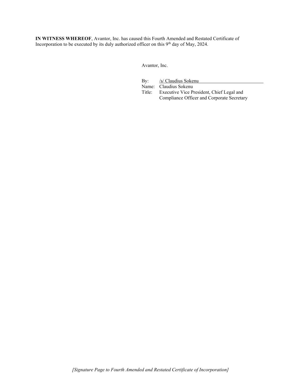 [Signature Page to Fourth Amended and Restated Certificate of Incorporation] IN WITNESS WHEREOF, Avantor, Inc. has caused this Fourth Amended and Restated Certificate of Incorporation to be executed by its duly authorized officer on this 9th day of May, 2024. Avantor, Inc. By: /s/ Claudius Sokenu Name: Claudius Sokenu Title: Executive Vice President, Chief Legal and Compliance Officer and Corporate Secretary