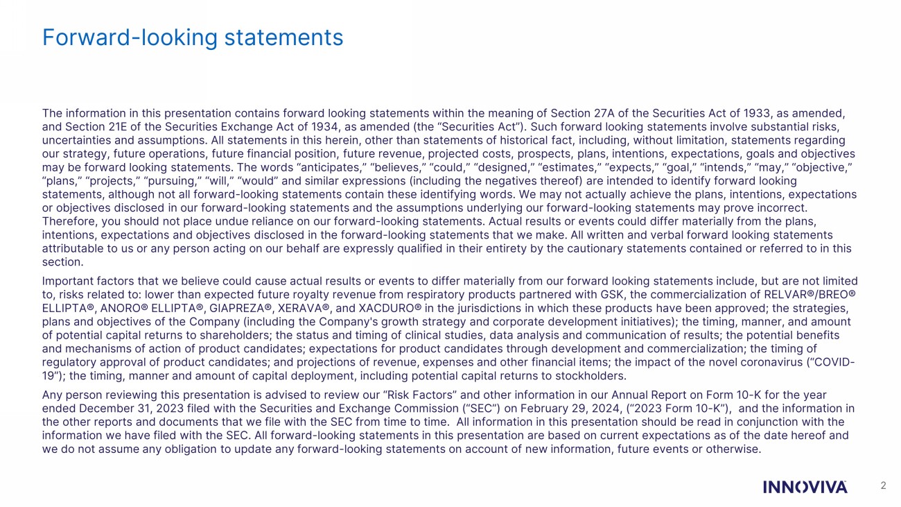 Forward - looking statements The information in this presentation contains forward looking statements within the meaning of Section 27A of the Securities Act of 1933, as amended, and Section 21E of the Securities Exchange Act of 1934, as amended (the “Securities Act”). Such forward looking statements in vol ve substantial risks, uncertainties and assumptions. All statements in this herein, other than statements of historical fact, including, without li mit ation, statements regarding our strategy, future operations, future financial position, future revenue, projected costs, prospects, plans, intentions, ex pec tations, goals and objectives may be forward looking statements. The words “anticipates,” “believes,” “could,” “designed,” “estimates,” “expects,” “goal,” “in tends,” “may,” “objective,” “plans,” “projects,” “pursuing,” “will,” “would” and similar expressions (including the negatives thereof) are intended to id ent ify forward looking statements, although not all forward - looking statements contain these identifying words. We may not actually achieve the plans, intentions, expectations or objectives disclosed in our forward - looking statements and the assumptions underlying our forward - looking statements may prov e incorrect. Therefore, you should not place undue reliance on our forward - looking statements. Actual results or events could differ material ly from the plans, intentions, expectations and objectives disclosed in the forward - looking statements that we make. All written and verbal forward looking statements attributable to us or any person acting on our behalf are expressly qualified in their entirety by the cautionary statements con tained or referred to in this section. Important factors that we believe could cause actual results or events to differ materially from our forward looking statemen ts include, but are not limited to, risks related to: lower than expected future royalty revenue from respiratory products partnered with GSK, the commercial iza tion of RELVAR®/BREO® ELLIPTA®, ANORO® ELLIPTA®, GIAPREZA®, XERAVA®, and XACDURO® in the jurisdictions in which these products have been approved; the strategies, plans and objectives of the Company (including the Company's growth strategy and corporate development initiatives); the timi ng, manner, and amount of potential capital returns to shareholders; the status and timing of clinical studies, data analysis and communication of r esu lts; the potential benefits and mechanisms of action of product candidates; expectations for product candidates through development and commercialization ; t he timing of regulatory approval of product candidates; and projections of revenue, expenses and other financial items; the impact of the nov el coronavirus (“COVID - 19”); the timing, manner and amount of capital deployment, including potential capital returns to stockholders. Any person reviewing this presentation is advised to review our “Risk Factors” and other information in our Annual Report on For m 10 - K for the year ended December 31, 2023 filed with the Securities and Exchange Commission (“SEC”) on February 29, 2024, (“2023 Form 10 - K”), and the information in the other reports and documents that we file with the SEC from time to time. All information in this presentation should be rea d in conjunction with the information we have filed with the SEC. All forward - looking statements in this presentation are based on current expectations as of the date hereof and we do not assume any obligation to update any forward - looking statements on account of new information, future events or otherwi se. 2