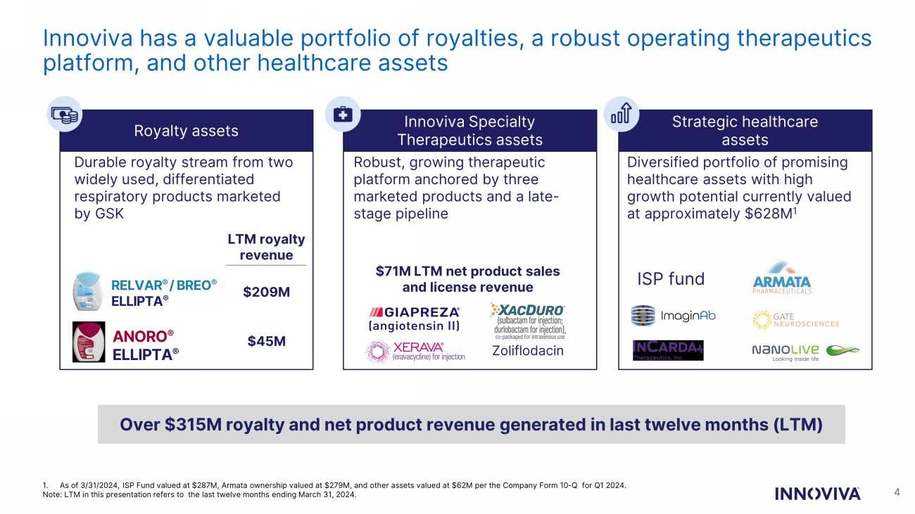 Innoviva at a glance 3 1. Strongly cashflow - positive, durable core royalty business stemming from widely used respiratory products 2. Commercial stage, growth - oriented critical care and infectious disease platform supported by late - stage pipeline 3. Diversified, valuable portfolio of healthcare assets 4. Thoughtful, robust approach to long - term capital deployment 5. Strong track record and value creation focus