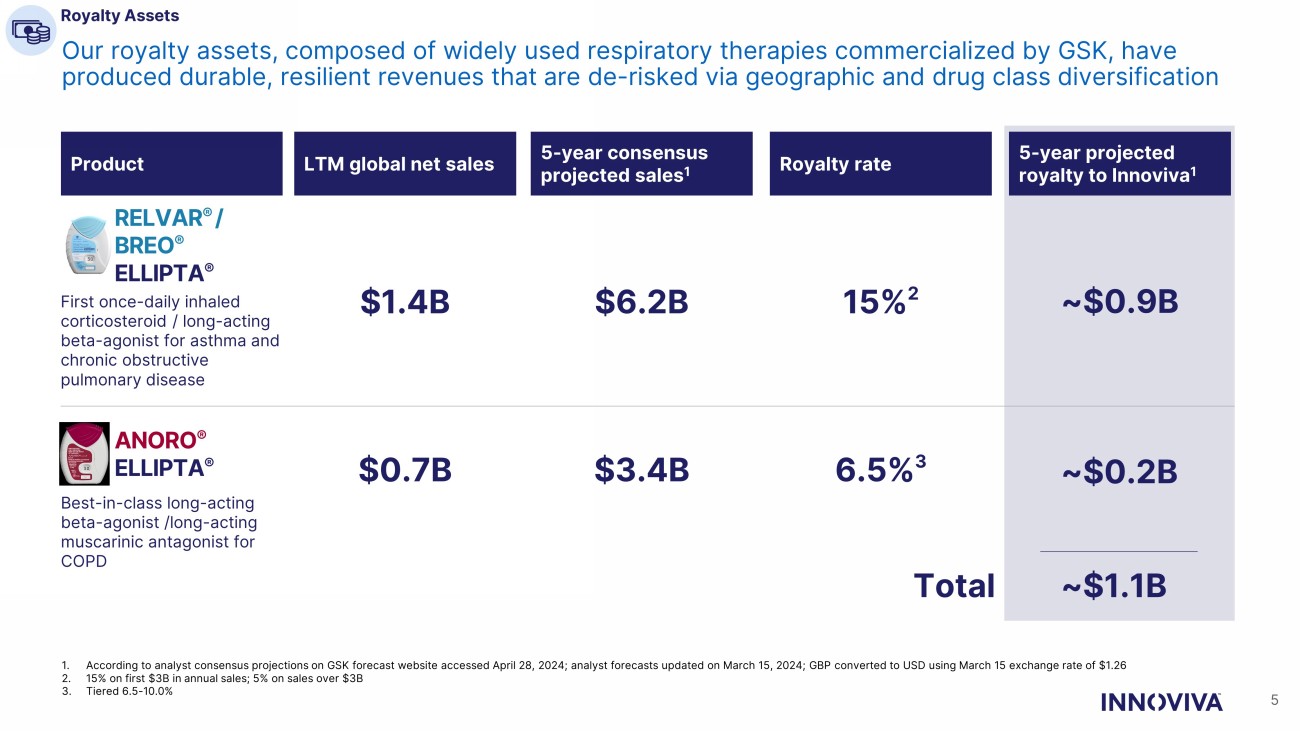 Innoviva has a valuable portfolio of royalties, a robust operating therapeutics platform, and other healthcare assets Royalty assets Innoviva Specialty Therapeutics assets Strategic healthcare assets Durable royalty stream from two widely used, differentiated respiratory products marketed by GSK RELVAR ® / BREO ® ELLIPTA ® ANORO ® ELLIPTA ® Robust, growing therapeutic platform anchored by three marketed products and a late - stage pipeline Diversified portfolio of promising healthcare assets with high growth potential currently valued at approximately $628M 1 Over $315M royalty and net product revenue generated in last twelve months (LTM) ISP fund Zoliflodacin 1. As of 3/31/2024, ISP Fund valued at $287M, Armata ownership valued at $279M, and other assets valued at $62M per the Company For m 10 - Q for Q1 2024. Note: LTM in this presentation refers to the last twelve months ending March 31, 2024. LTM royalty revenue $209M $45M $71M LTM net product sales and license revenue 4