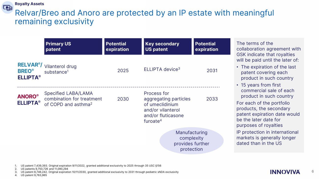 Royalty Assets 5 Our royalty assets, composed of widely used respiratory therapies commercialized by GSK, have produced durable, resilient revenues that are de - risked via geographic and drug class diversification 1. According to analyst consensus projections on GSK forecast website accessed April 28, 2024; analyst forecasts updated on Marc h 1 5, 2024; GBP converted to USD using March 15 exchange rate of $1.26 2. 15% on first $3B in annual sales; 5% on sales over $3B 3. Tiered 6.5 - 10.0% RELVAR ® / BREO ® ELLIPTA ® ANORO ® ELLIPTA ® First once - daily inhaled corticosteroid / long - acting beta - agonist for asthma and chronic obstructive pulmonary disease Best - in - class long - acting beta - agonist /long - acting muscarinic antagonist for COPD 15% 2 6.5% 3 ~$0.2B ~$0.9B $6.2B $3.4B Total ~$1.1B Product 5 - year consensus projected sales 1 Royalty rate 5 - year projected royalty to Innoviva 1 $1.4B $0.7B LTM global net sales