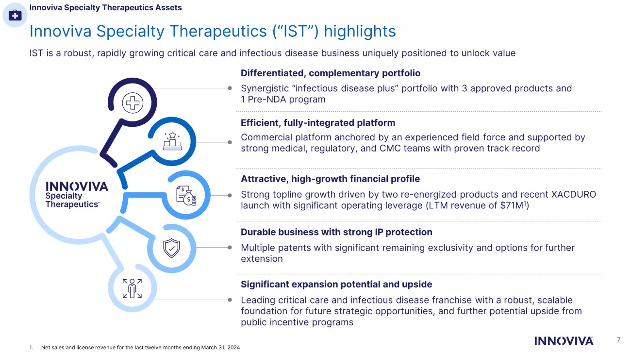 IST has a diversified portfolio of high growth hospital and critical care products addressing sizeable markets with significant unmet needs Zoliflodacin Indication LTM net sales and license revenue Selected future growth drivers Vasoconstrictor to increase blood pressure in adults with septic or other distributive shock Antibacterial for the treatment of complicated intra - abdominal infections Antibacterial for the treatment of HABP/VABP caused by Acinetobacter baumanii Oral antibacterial in development for treatment of uncomplicated gonorrhea , including resistant strains $44M $23M 1 $4M (Sept 2023 launch) N/A (NDA submission planned early 2025) • Potential guidelines update and inclusion of GIAPREZA • Additional data generation and real - world evidence, including investigator - initiated studies • Rising rates of ESBL resistance 2 • Growing urgency of the need for carbapenem - sparing agents • Only therapy indicated specifically for Acinetobacter infections • Rising rates of resistance globally • Rising rates of resistance to only remaining standard of care, ceftriaxone • Convenience of oral (vs. in - person intramuscular injection) Innoviva Specialty Therapeutics Assets 8 Marketed products Development pipeline Product 1. Includes $3M in milestone license revenue 2. Antimicrobial Resistance Infection Control 10: 118 (2021)