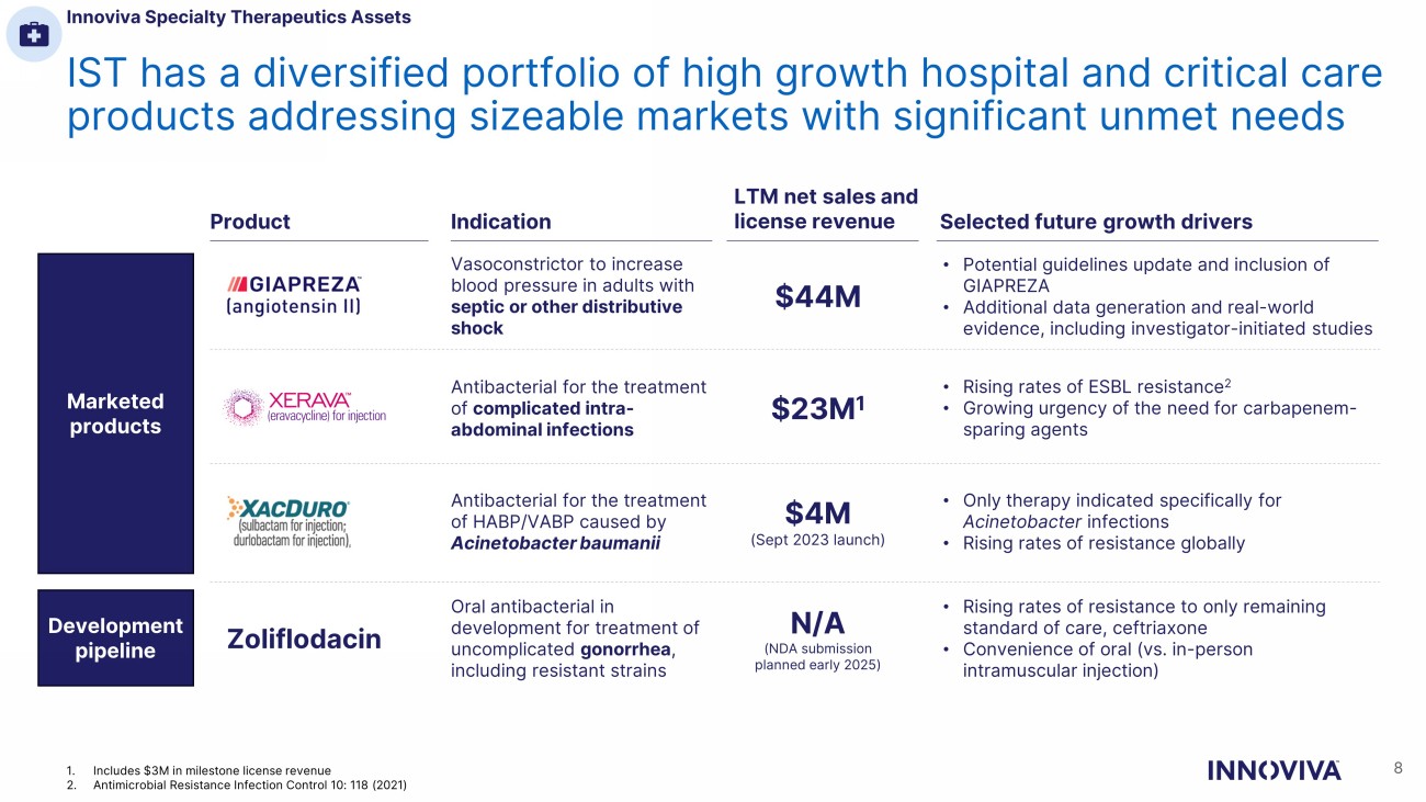 Innoviva Specialty Therapeutics (“IST”) highlights IST is a robust, rapidly growing critical care and infectious disease business uniquely positioned to unlock value Synergistic “infectious disease plus” portfolio with 3 approved products and 1 Pre - NDA program Commercial platform anchored by an experienced field force and supported by strong medical, regulatory, and CMC teams with proven track record Strong topline growth driven by two re - energized products and recent XACDURO launch with significant operating leverage (LTM revenue of $71M 1 ) Multiple patents with significant remaining exclusivity and options for further extension Leading critical care and infectious disease franchise with a robust, scalable foundation for future strategic opportunities, and further potential upside from public incentive programs Differentiated, complementary portfolio Efficient, fully - integrated platform Attractive, high - growth financial profile Durable business with strong IP protection Significant expansion potential and upside Innoviva Specialty Therapeutics Assets 7 1. Net sales and license revenue for the last twelve months ending March 31, 2024