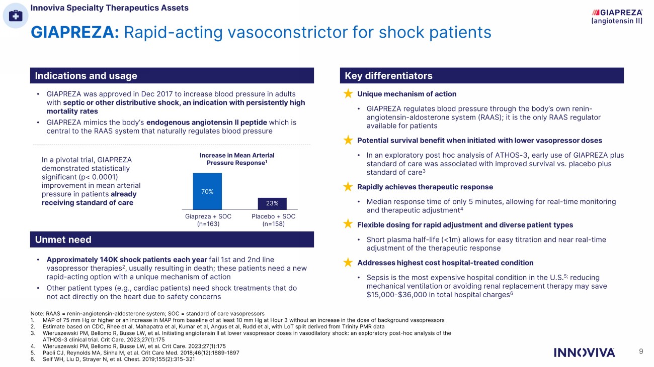 GIAPREZA: Rapid - acting vasoconstrictor for shock patients Indications and usage Key differentiators Unmet need • GIAPREZA was approved in Dec 2017 to increase blood pressure in adults with septic or other distributive shock, an indication with persistently high mortality rates • GIAPREZA mimics the body’s endogenous angiotensin II peptide which is central to the RAAS system that naturally regulates blood pressure • Approximately 140K shock patients each year fail 1st and 2nd line vasopressor therapies 2 , usually resulting in death; these patients need a new rapid - acting option with a unique mechanism of action • Other patient types (e.g., cardiac patients) need shock treatments that do not act directly on the heart due to safety concerns 70% 23% Increase in Mean Arterial Pressure Response 1 In a pivotal trial, GIAPREZA demonstrated statistically significant (p< 0.0001) improvement in mean arterial pressure in patients already receiving standard of care Unique mechanism of action • GIAPREZA regulates blood pressure through the body’s own renin - angiotensin - aldosterone system (RAAS); it is the only RAAS regulator available for patients Potential survival benefit when initiated with lower vasopressor doses • In an exploratory post hoc analysis of ATHOS - 3, early use of GIAPREZA plus standard of care was associated with improved survival vs. placebo plus standard of care 3 Rapidly achieves therapeutic response • Median response time of only 5 minutes, allowing for real - time monitoring and therapeutic adjustment 4 Flexible dosing for rapid adjustment and diverse patient types • Short plasma half - life (<1m) allows for easy titration and near real - time adjustment of the therapeutic response Addresses highest cost hospital - treated condition • Sepsis is the most expensive hospital condition in the U.S. 5; reducing mechanical ventilation or avoiding renal replacement therapy may save $15,000 - $36,000 in total hospital charges 6 Giapreza + SOC (n=163) Placebo + SOC (n=158) Innoviva Specialty Therapeutics Assets 9 Note: RAAS = renin - angiotensin - aldosterone system; SOC = standard of care vasopressors 1. MAP of 75 mm Hg or higher or an increase in MAP from baseline of at least 10 mm Hg at Hour 3 without an increase in the dose of background vasopressors 2. Estimate based on CDC, Rhee et al, Mahapatra et al, Kumar et al, Angus et al, Rudd et al, with LoT split derived from Trinity PMR data 3. Wieruszewski PM, Bellomo R, Busse LW, et al. Initiating angiotensin II at lower vasopressor doses in vasodilatory shock: an exploratory post - hoc analysis of the ATHOS - 3 clinical trial. Crit Care. 2023;27(1):175 4. Wieruszewski PM, Bellomo R, Busse LW, et al. Crit Care. 2023;27(1):175 5. Paoli CJ, Reynolds MA, Sinha M, et al. Crit Care Med. 2018;46(12):1889 - 1897 6. Self WH, Liu D, Strayer N, et al. Chest. 2019;155(2):315 - 321