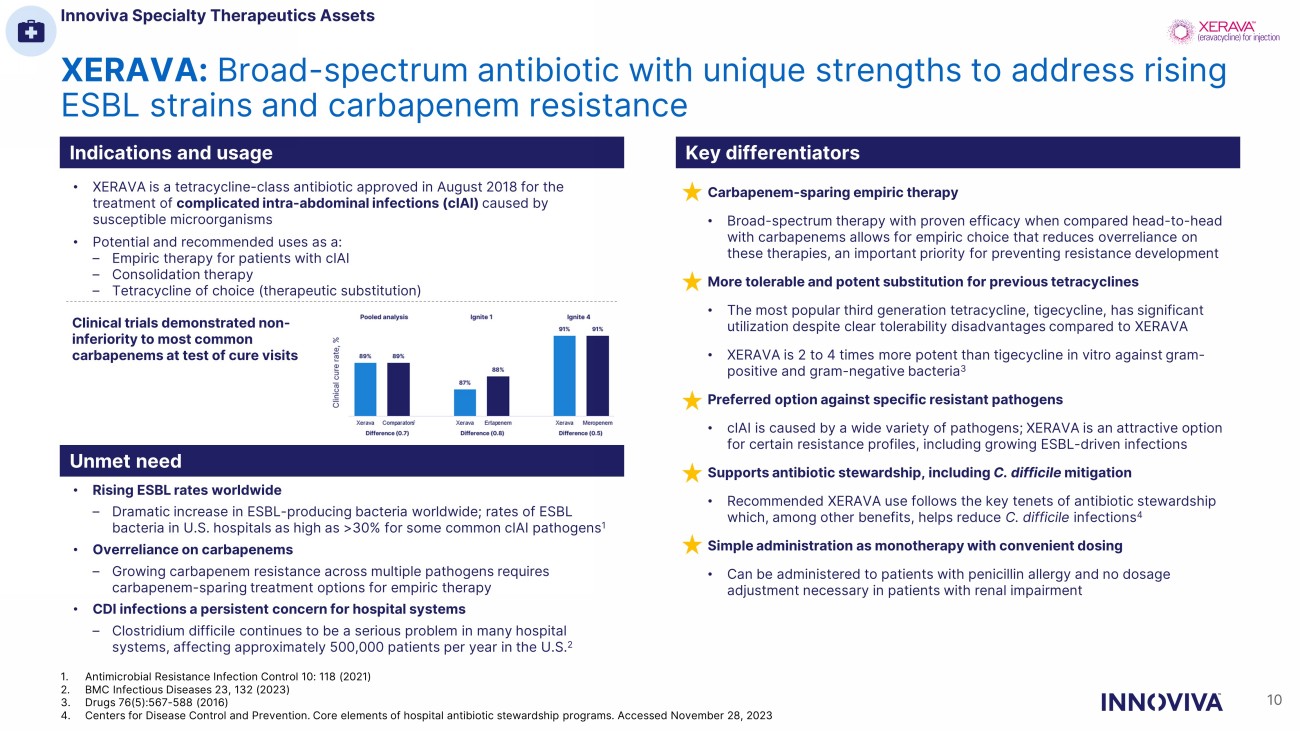 XERAVA: Broad - spectrum antibiotic with unique strengths to address rising ESBL strains and carbapenem resistance Indications and usage Key differentiators Unmet need • XERAVA is a tetracycline - class antibiotic approved in August 2018 for the treatment of complicated intra - abdominal infections (cIAI) caused by susceptible microorganisms • Potential and recommended uses as a: – Empiric therapy for patients with cIAI – Consolidation therapy – Tetracycline of choice (therapeutic substitution) • Rising ESBL rates worldwide – Dramatic increase in ESBL - producing bacteria worldwide; rates of ESBL bacteria in U.S. hospitals as high as >30% for some common cIAI pathogens 1 • Overreliance on carbapenems – Growing carbapenem resistance across multiple pathogens requires carbapenem - sparing treatment options for empiric therapy • CDI infections a persistent concern for hospital systems – Clostridium difficile continues to be a serious problem in many hospital systems, affecting approximately 500,000 patients per year in the U.S. 2 Clinical trials demonstrated non - inferiority to most common carbapenems at test of cure visits Carbapenem - sparing empiric therapy • Broad - spectrum therapy with proven efficacy when compared head - to - head with carbapenems allows for empiric choice that reduces overreliance on these therapies, an important priority for preventing resistance development More tolerable and potent substitution for previous tetracyclines • The most popular third generation tetracycline, tigecycline, has significant utilization despite clear tolerability disadvantages compared to XERAVA • XERAVA is 2 to 4 times more potent than tigecycline in vitro against gram - positive and gram - negative bacteria 3 Preferred option against specific resistant pathogens • cIAI is caused by a wide variety of pathogens; XERAVA is an attractive option for certain resistance profiles, including growing ESBL - driven infections Supports antibiotic stewardship, including C. difficile mitigation • Recommended XERAVA use follows the key tenets of antibiotic stewardship which, among other benefits, helps reduce C. difficile infections 4 Simple administration as monotherapy with convenient dosing • Can be administered to patients with penicillin allergy and no dosage adjustment necessary in patients with renal impairment Innoviva Specialty Therapeutics Assets 10 1. Antimicrobial Resistance Infection Control 10: 118 (2021) 2. BMC Infectious Diseases 23, 132 (2023) 3. Drugs 76(5):567 - 588 (2016) 4. Centers for Disease Control and Prevention. Core elements of hospital antibiotic stewardship programs. Accessed November 28, 202 3