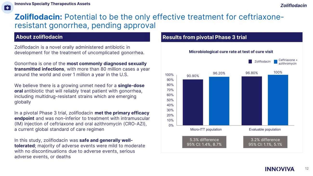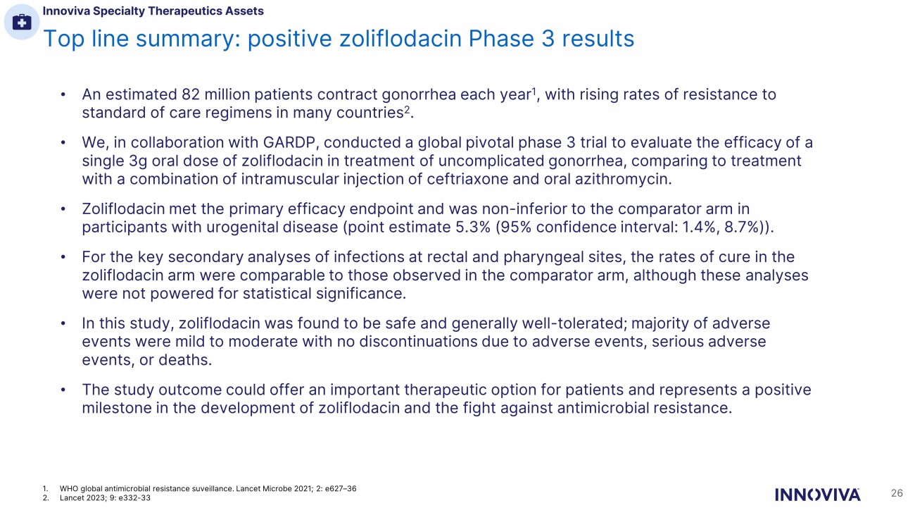 Top line summary: positive zoliflodacin Phase 3 results • An estimated 82 million patients contract gonorrhea each year 1 , with rising rates of resistance to standard of care regimens in many countries 2 . • We, in collaboration with GARDP, conducted a global pivotal phase 3 trial to evaluate the efficacy of a single 3g oral dose of zoliflodacin in treatment of uncomplicated gonorrhea, comparing to treatment with a combination of intramuscular injection of ceftriaxone and oral azithromycin. • Zoliflodacin met the primary efficacy endpoint and was non - inferior to the comparator arm in participants with urogenital disease (point estimate 5.3% (95% confidence interval: 1.4%, 8.7%)). • For the key secondary analyses of infections at rectal and pharyngeal sites, the rates of cure in the zoliflodacin arm were comparable to those observed in the comparator arm, although these analyses were not powered for statistical significance. • In this study, zoliflodacin was found to be safe and generally well - tolerated; majority of adverse events were mild to moderate with no discontinuations due to adverse events, serious adverse events, or deaths. • The study outcome could offer an important therapeutic option for patients and represents a positive milestone in the development of zoliflodacin and the fight against antimicrobial resistance. Innoviva Specialty Therapeutics Assets 1. WHO global antimicrobial resistance suveillance. Lancet Microbe 2021; 2: e627 – 36 2. Lancet 2023; 9: e332 - 33 26