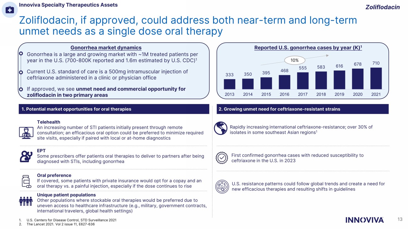 Zoliflodacin: Potential to be the only effective treatment for ceftriaxone - resistant gonorrhea, pending approval Zoliflodacin About zoliflodacin Zoliflodacin is a novel orally administered antibiotic in development for the treatment of uncomplicated gonorrhea. Gonorrhea is one of the most commonly diagnosed sexually transmitted infections , with more than 80 million cases a year around the world and over 1 million a year in the U.S. We believe there is a growing unmet need for a single - dose oral antibiotic that will reliably treat patient with gonorrhea, including multidrug - resistant strains which are emerging globally In a pivotal Phase 3 trial, zoliflodacin met the primary efficacy endpoint and was non - inferior to treatment with intramuscular (IM) injection of ceftriaxone and oral azithromycin (CRO - AZI), a current global standard of care regimen In this study, zoliflodacin was safe and generally well - tolerated ; majority of adverse events were mild to moderate with no discontinuations due to adverse events, serious adverse events, or deaths 90.90% 96.80% 96.20% 100% 0% 10% 20% 30% 40% 50% 60% 70% 80% 90% 100% Micro-ITT population Evaluable population Zoliflodacin Ceftriaxone + azithromycin 5.3% difference 95% CI: 1.4%, 8.7% 3.2% difference 95% CI: 1.1%, 5.1% Microbiological cure rate at test of cure visit Results from pivotal Phase 3 trial About zoliflodacin Innoviva Specialty Therapeutics Assets 12