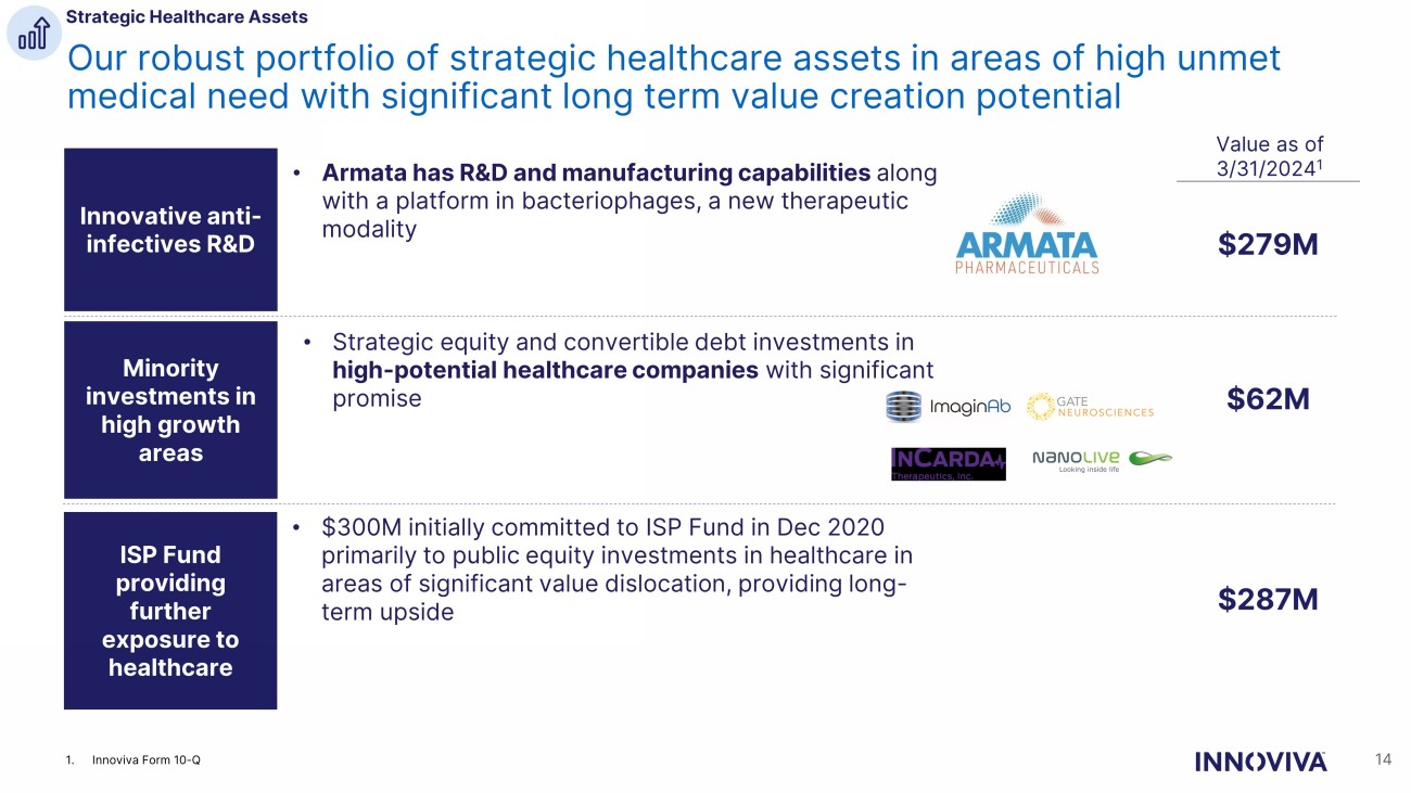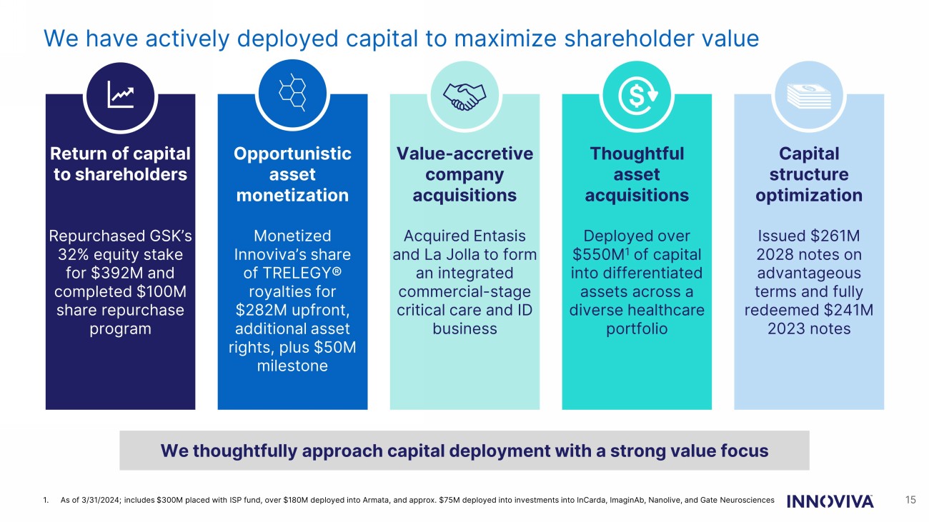 Minority investments in high growth areas • Strategic equity and convertible debt investments in high - potential healthcare companies with significant promise ISP Fund providing further exposure to healthcare • $300M initially committed to ISP Fund in Dec 2020 primarily to public equity investments in healthcare in areas of significant value dislocation, providing long - term upside Innovative anti - infectives R&D • Armata has R&D and manufacturing capabilities along with a platform in bacteriophages, a new therapeutic modality 14 Our robust portfolio of strategic healthcare assets in areas of high unmet medical need with significant long term value creation potential Strategic Healthcare Assets Value as of 3/31/2024 1 $279M $62M $287M 1. Innoviva Form 10 - Q