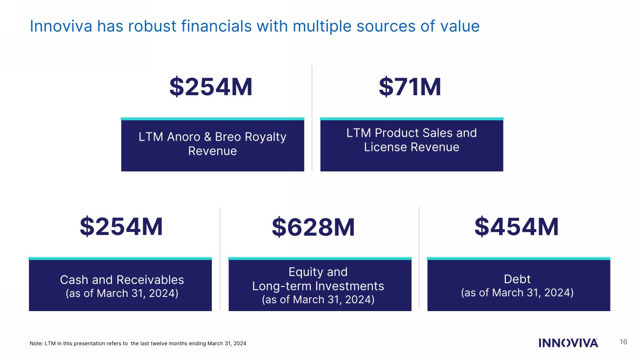 We have actively deployed capital to maximize shareholder value 15 Return of capital to shareholders Repurchased GSK’s 32% equity stake for $392M and completed $100M share repurchase program Opportunistic asset monetization Monetized Innoviva’s share of TRELEGY® royalties for $282M upfront, additional asset rights, plus $50M milestone Value - accretive company acquisitions Acquired Entasis and La Jolla to form an integrated commercial - stage critical care and ID business Thoughtful asset acquisitions Deployed over $550M 1 of capital into differentiated assets across a diverse healthcare portfolio Capital structure optimization Issued $261M 2028 notes on advantageous terms and fully redeemed $241M 2023 notes We thoughtfully approach capital deployment with a strong value focus 1. As of 3/31/2024; includes $300M placed with ISP fund, over $180M deployed into Armata, and approx. $75M deployed into investm ent s into InCarda, ImaginAb, Nanolive, and Gate Neurosciences