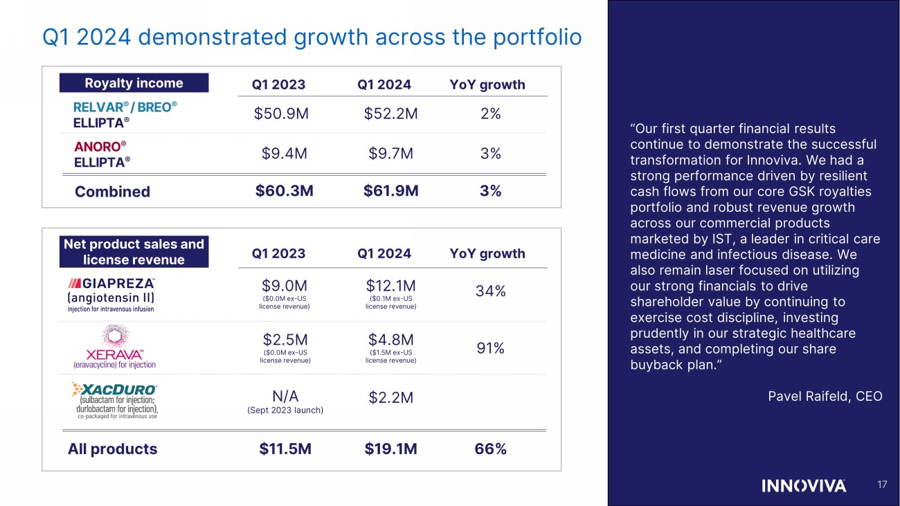 Innoviva has robust financials with multiple sources of value 16 $254M Cash and Receivables (as of March 31, 2024) Equity and Long - term Investments (as of March 31, 2024) LTM Product Sales and License Revenue $71M $628M $454M Debt (as of March 31, 2024) LTM Anoro & Breo Royalty Revenue $254M Note: LTM in this presentation refers to the last twelve months ending March 31, 2024