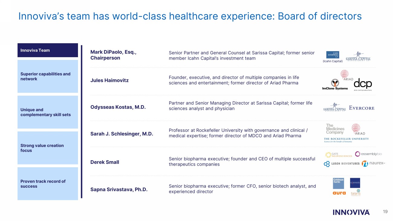 Innoviva’s team has world - class healthcare experience: Management 18 Innoviva Team Superior capabilities and network Unique and complementary skill sets Strong value creation focus Proven track record of success Pavel Raifeld Chief Executive Officer Steve Basso Chief Financial Officer Marianne Zhen, CPA Chief Accounting Officer Marcie Cain Chief People Officer Matt Ronsheim, Ph.D. President, IST Experienced finance and life sciences professional with background in senior roles in consulting, banking, and investing Finance professional with over 30 years of financial leadership with both established and growth stage pharmaceutical companies Finance professional with over 20 years in accounting and strategic operations in life sciences and technology companies Human resources executive with a focus on rapidly growing & scaling life sciences companies Accomplished leader with decades of biopharma leadership experience across a range of functions and operational roles