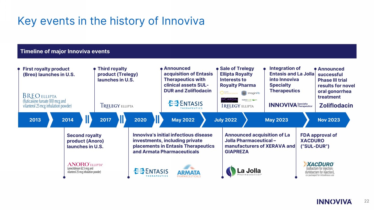 Key events in the history of Innoviva 2020 May 2022 July 2022 Nov 2023 First royalty product (Breo) launches in U.S. Announced successful Phase III trial results for novel oral gonorrhea treatment Innoviva’s initial infectious disease investments, including private placements in Entasis Therapeutics and Armata Pharmaceuticals Announced acquisition of La Jolla Pharmaceutical – manufacturers of XERAVA and GIAPREZA 2013 2014 Second royalty product (Anoro) launches in U.S. Zoliflodacin 2017 Announced acquisition of Entasis Therapeutics with clinical assets SUL - DUR and Zoliflodacin Integration of Entasis and La Jolla into Innoviva Specialty Therapeutics FDA approval of XACDURO (“SUL - DUR”) Sale of Trelegy Ellipta Royalty Interests to Royalty Pharma Third royalty product ( Trelegy ) launches in U.S. Timeline of major Innoviva events May 2023 22