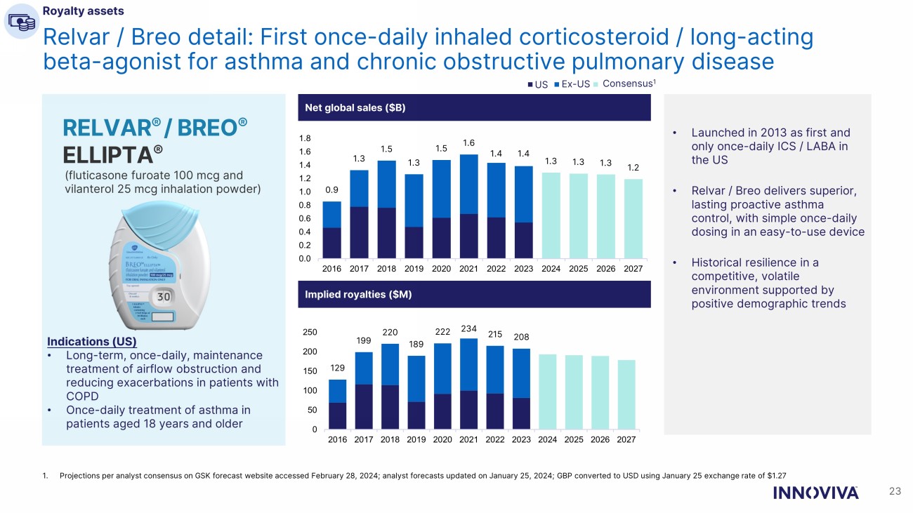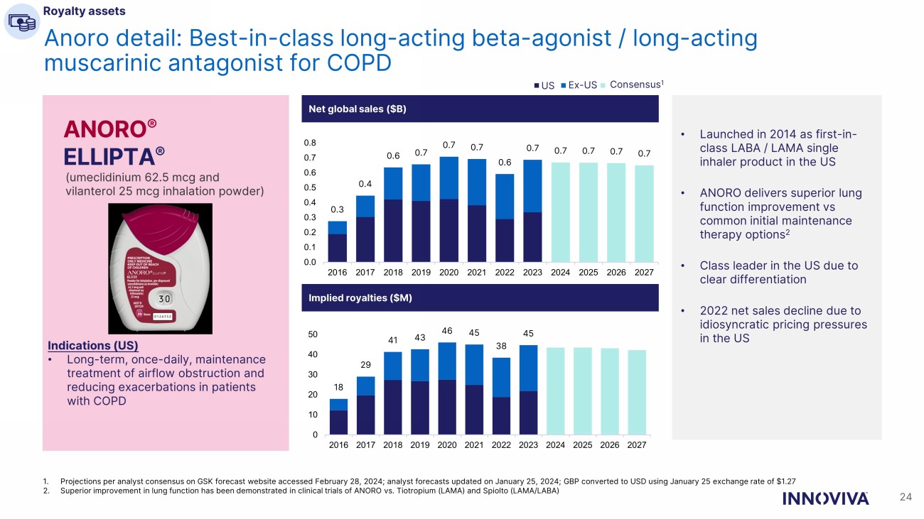 23 Relvar / Breo detail: First once - daily inhaled corticosteroid / long - acting beta - agonist for asthma and chronic obstructive pulmonary disease Net global sales ($B) RELVAR ® / BREO ® ELLIPTA ® (fluticasone furoate 100 mcg and vilanterol 25 mcg inhalation powder) Indications (US) • Long - term, once - daily, maintenance treatment of airflow obstruction and reducing exacerbations in patients with COPD • Once - daily treatment of asthma in patients aged 18 years and older • Launched in 2013 as first and only once - daily ICS / LABA in the US • Relvar / Breo delivers superior, lasting proactive asthma control, with simple once - daily dosing in an easy - to - use device • Historical resilience in a competitive, volatile environment supported by positive demographic trends Implied royalties ($M) Royalty assets 1. Projections per analyst consensus on GSK forecast website accessed February 28, 2024; analyst forecasts updated on January 25 , 2 024; GBP converted to USD using January 25 exchange rate of $1.27 US Ex - US Consensus 1 0.9 1.3 1.5 1.3 1.5 1.6 1.4 1.4 1.3 1.3 1.3 1.2 0.0 0.2 0.4 0.6 0.8 1.0 1.2 1.4 1.6 1.8 2016 2017 2018 2019 2020 2021 2022 2023 2024 2025 2026 2027 129 199 220 189 222 234 215 208 0 50 100 150 200 250 2016 2017 2018 2019 2020 2021 2022 2023 2024 2025 2026 2027