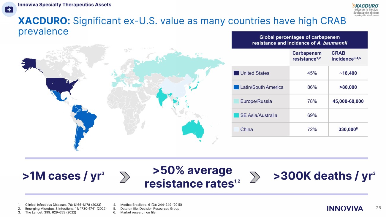 XACDURO: First pathogen - targeted therapy approved for life threatening Acinetobacter infections Indications and usage Key differentiators Unmet need • XACDURO is the first pathogen - targeted therapy approved for the treatment of hospital - acquired and ventilator - associated bacterial pneumonia caused by susceptible strains of Acinetobacter baumannii - calcoaceticus complex • Drug resistant Acinetobacter has been identified by the CDC and WHO as an urgent global public health threat with over 300K annual deaths 1 associated with carbapenem - resistant infections worldwide • Carbapenem - resistant Acinetobacter (CRAB) infections have a ~40% mortality rate in the United States despite best current antibiotic treatment XACDURO demonstrated statistical non - inferiority to colistin on 28 - day all - cause mortality in patients with carbapenem - resistant Acinetobacter infections Only therapy specifically approved for Acinetobacter infections • With no existing antibiotics proven effective for carbapenem - resistant cases, XACDURO is a clear standout as first choice for these infections Specific pathogen - targeted drug design • End - to - end R&D focus on resistant Acinetobacter cases provides a unique advantage with clear and easy messaging to HCPs and hospital systems Statistically significant difference in nephrotoxicity vs. colistin • Pivotal trial demonstrated overall positive benefit / risk profile compared to colistin, with lower incidence in nephrotoxicity – a serious complication, particularly for ICU patients Positioned to avoid common stewardship and access concerns • Other branded antibiotics push for broad empiric use but are held back by stewardship and budget concerns; XACDURO is positioned to be used for specific infections only, allowing it to be used in these settings without raising the same stewardship or budget concerns New - Technology Add - On Payment (NTAP) • Starting October 1, 2023, NTAP provides hospitals an incremental payment in addition to the standard MS - DRG reimbursement up to $13,680 for patients treated with XACDURO per qualifying case Innoviva Specialty Therapeutics Assets 11 Note: SOC = Standard of Care 1. Antimicrobial Resistance Collaborators Lancet 2022; 399: 629 – 55 2. Kaye et al. Lancet Infect Dis. 2023 May 11:S1473 - 3099(23)00184 - 6