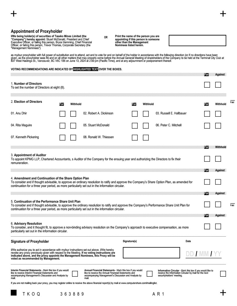 Exhibit 99.2 to this report on Form 6-K furnished to the SEC is expressly incorporated by reference into the Registration Statement on Form F-10 of Taseko Mines Limited (File No. 333-271142), as amended and supplemented.