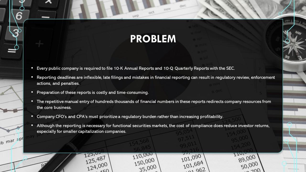 PROBLEM • Every public company is required to file 10 - K Annual Reports and 10 - Q Quarterly Reports with the SEC. • Reporting deadlines are inflexible, late filings and mistakes in financial reporting can result in regulatory review, enforce men t actions, and penalties. • Preparation of these reports is costly and time - consuming. • The repetitive manual entry of hundreds thousands of financial numbers in these reports redirects company resources from the core business. • Company CFO’s and CPA’s must prioritize a regulatory burden rather than increasing profitability. • Although the reporting is necessary for functional securities markets, the cost of compliance does reduce investor returns, especially for smaller capitalization companies.