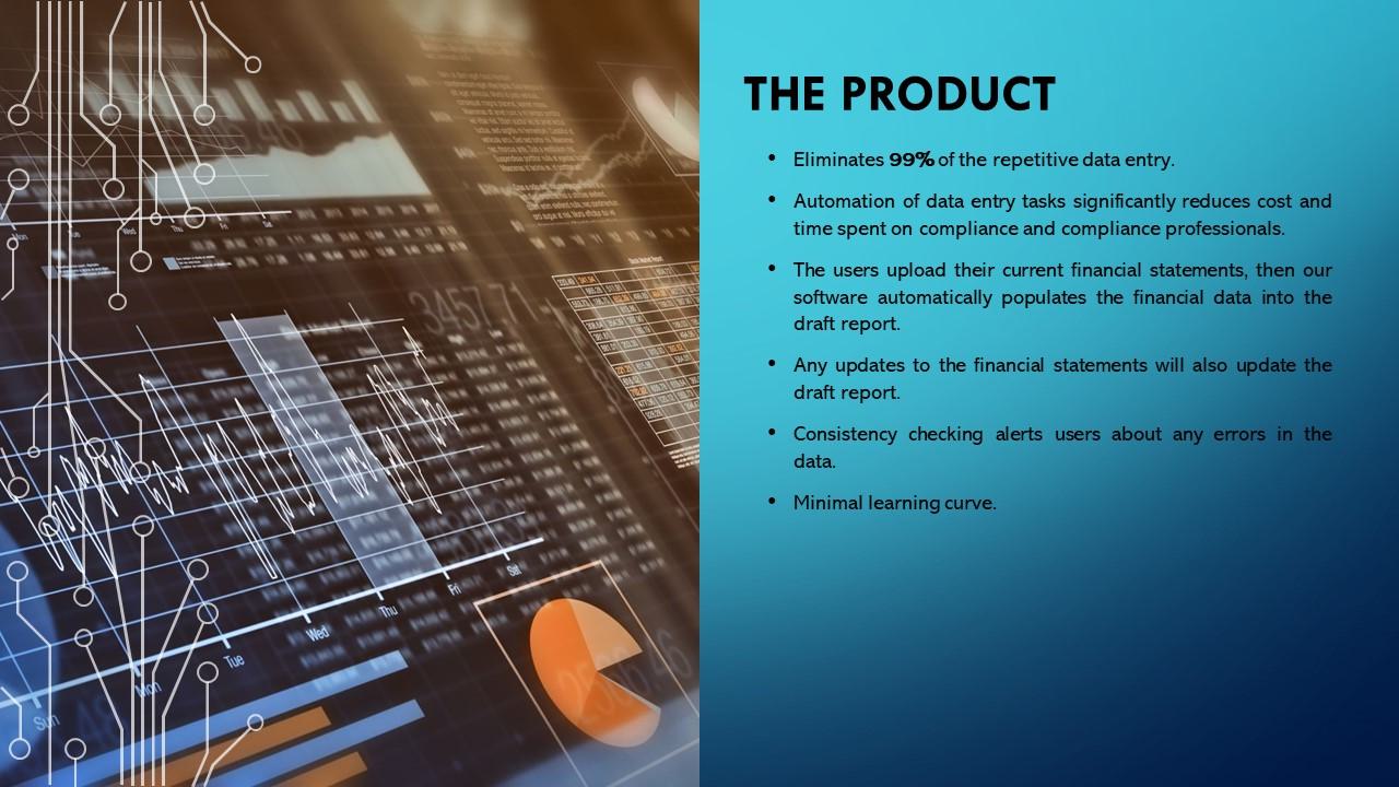 THE PRODUCT • Eliminates 99 % of the repetitive data entry . • Automation of data entry tasks significantly reduces cost and time spent on compliance and compliance professionals . • The users upload their current financial statements, then our software automatically populates the financial data into the draft report . • Any updates to the financial statements will also update the draft report . • Consistency checking alerts users about any errors in the data . • Minimal learning curve .