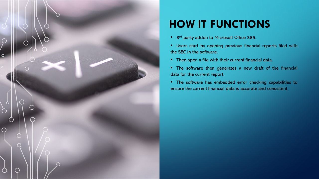 HOW IT FUNCTIONS • 3 rd party addon to Microsoft Office 365 . • Users start by opening previous financial reports filed with the SEC in the software . • T hen open a file with their current financial data . • The software then generates a new draft of the financial data for the current report . • T he software has embedded error checking capabilities to ensure the current financial data is accurate and consistent .