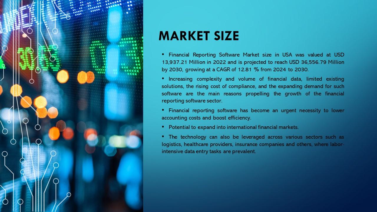 MARKET SIZE • Financial Reporting Software Market size in USA was valued at USD 13 , 937 . 21 Million in 2022 and is projected to reach USD 36 , 556 . 79 Million by 2030 , growing at a CAGR of 12 . 81 % from 2024 to 2030 . • Increasing complexity and volume of financial data, limited existing solutions, the rising cost of compliance, and the expanding demand for such software are the main reasons propelling the growth of the financial reporting software sector . • F inancial reporting software has become an urgent necessity to lower accounting costs and boost efficiency . • Potential to expand into international financial markets . • The technology can also be leveraged across various sectors such as logistics, healthcare providers, insurance companies and others, where labor - intensive data entry tasks are prevalent .