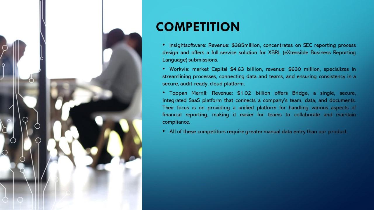 COMPETITION • Insightsoftware : Revenue : $ 385 million, concentrates on SEC reporting process design and offers a full - service solution for XBRL ( eXtensible Business Reporting Language) submissions . • Workvia : market Capital $ 4 . 63 billion, revenue : $ 630 million, specializes in streamlining processes, connecting data and teams, and ensuring consistency in a secure, audit - ready, cloud platform . • Toppan Merrill : Revenue : $ 1 . 02 billion offers Bridge, a single, secure, integrated SaaS platform that connects a company’s team, data, and documents . Their focus is on providing a unified platform for handling various aspects of financial reporting, making it easier for teams to collaborate and maintain compliance . • All of these competitors require greater manual data entry than our product .