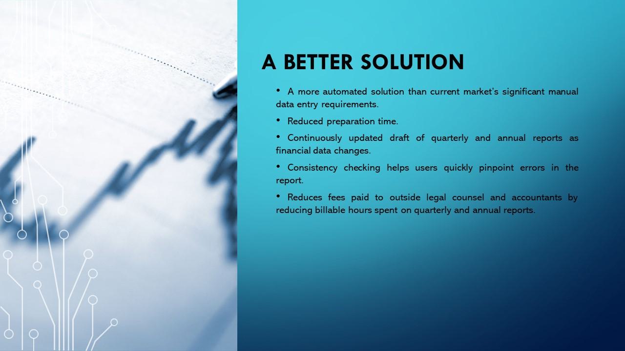 A BETTER SOLUTION • A more automated solution than current market’s significant manual data entry requirements . • Reduced preparation time . • Continuously updated draft of quarterly and annual reports as financial data changes . • Consistency checking helps users quickly pinpoint errors in the report . • Reduces fees paid to outside legal counsel and accountants by reducing billable hours spent on quarterly and annual reports .