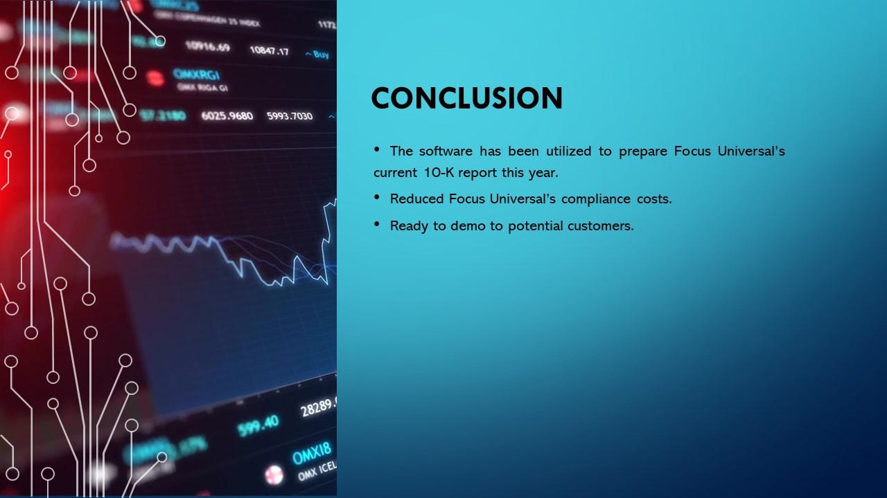 CONCLUSION • The software has been utilized to prepare Focus Universal’s current 10 - K report this year . • Reduced Focus Universal’s compliance costs . • Ready to d emo to potential customers .