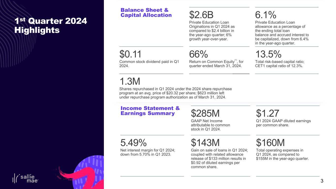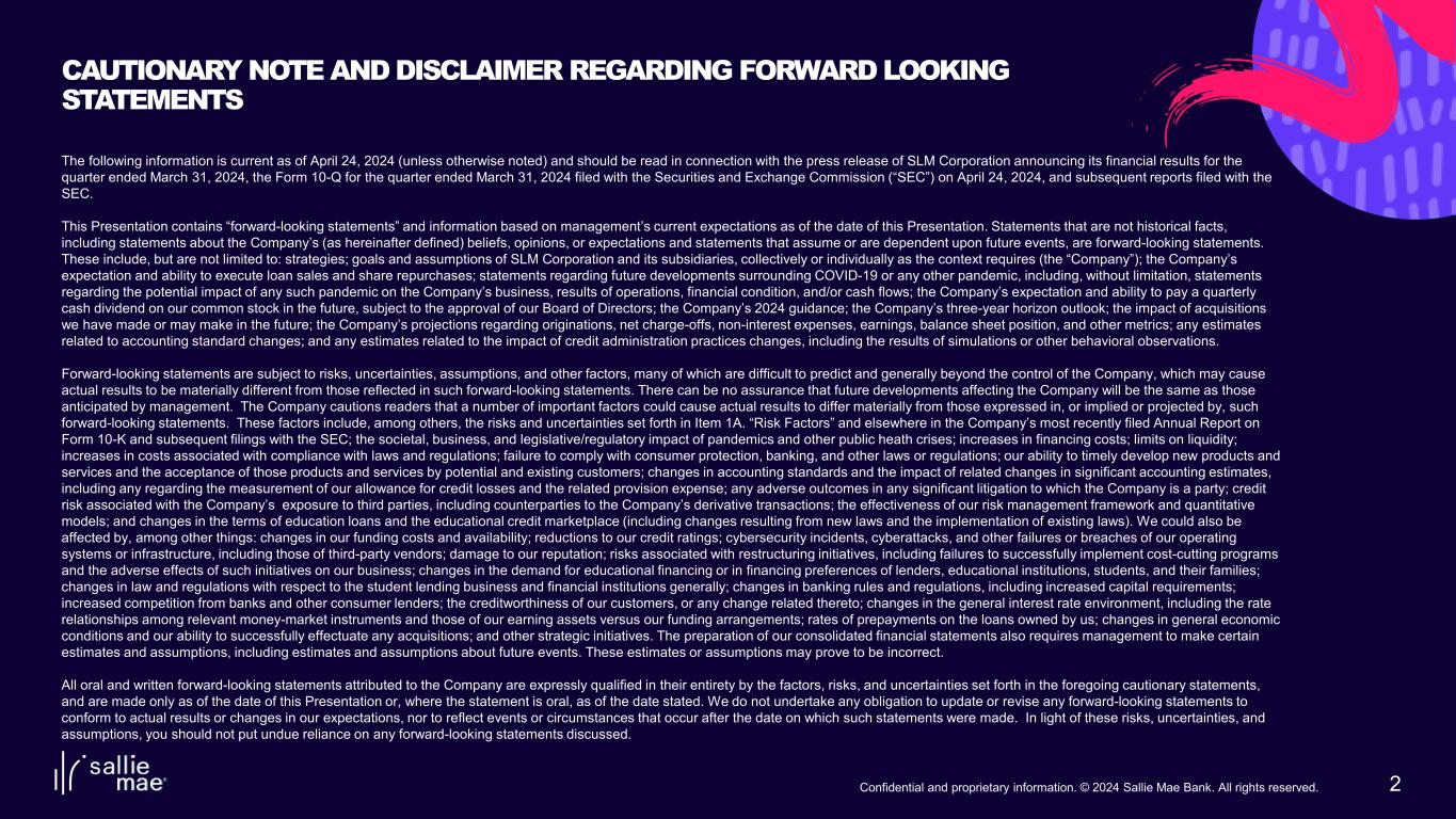 2 The following information is current as of April 24, 2024 (unless otherwise noted) and should be read in connection with the press release of SLM Corporation announcing its financial results for the quarter ended March 31, 2024, the Form 10-Q for the quarter ended March 31, 2024 filed with the Securities and Exchange Commission (“SEC”) on April 24, 2024, and subsequent reports filed with the SEC. This Presentation contains “forward-looking statements” and information based on management’s current expectations as of the date of this Presentation. Statements that are not historical facts, including statements about the Company’s (as hereinafter defined) beliefs, opinions, or expectations and statements that assume or are dependent upon future events, are forward-looking statements. These include, but are not limited to: strategies; goals and assumptions of SLM Corporation and its subsidiaries, collectively or individually as the context requires (the “Company”); the Company’s expectation and ability to execute loan sales and share repurchases; statements regarding future developments surrounding COVID-19 or any other pandemic, including, without limitation, statements regarding the potential impact of any such pandemic on the Company’s business, results of operations, financial condition, and/or cash flows; the Company’s expectation and ability to pay a quarterly cash dividend on our common stock in the future, subject to the approval of our Board of Directors; the Company’s 2024 guidance; the Company’s three-year horizon outlook; the impact of acquisitions we have made or may make in the future; the Company’s projections regarding originations, net charge-offs, non-interest expenses, earnings, balance sheet position, and other metrics; any estimates related to accounting standard changes; and any estimates related to the impact of credit administration practices changes, including the results of simulations or other behavioral observations. Forward-looking statements are subject to risks, uncertainties, assumptions, and other factors, many of which are difficult to predict and generally beyond the control of the Company, which may cause actual results to be materially different from those reflected in such forward-looking statements. There can be no assurance that future developments affecting the Company will be the same as those anticipated by management. The Company cautions readers that a number of important factors could cause actual results to differ materially from those expressed in, or implied or projected by, such forward-looking statements. These factors include, among others, the risks and uncertainties set forth in Item 1A. “Risk Factors” and elsewhere in the Company’s most recently filed Annual Report on Form 10-K and subsequent filings with the SEC; the societal, business, and legislative/regulatory impact of pandemics and other public heath crises; increases in financing costs; limits on liquidity; increases in costs associated with compliance with laws and regulations; failure to comply with consumer protection, banking, and other laws or regulations; our ability to timely develop new products and services and the acceptance of those products and services by potential and existing customers; changes in accounting standards and the impact of related changes in significant accounting estimates, including any regarding the measurement of our allowance for credit losses and the related provision expense; any adverse outcomes in any significant litigation to which the Company is a party; credit risk associated with the Company’s exposure to third parties, including counterparties to the Company’s derivative transactions; the effectiveness of our risk management framework and quantitative models; and changes in the terms of education loans and the educational credit marketplace (including changes resulting from new laws and the implementation of existing laws). We could also be affected by, among other things: changes in our funding costs and availability; reductions to our credit ratings; cybersecurity incidents, cyberattacks, and other failures or breaches of our operating systems or infrastructure, including those of third-party vendors; damage to our reputation; risks associated with restructuring initiatives, including failures to successfully implement cost-cutting programs and the adverse effects of such initiatives on our business; changes in the demand for educational financing or in financing preferences of lenders, educational institutions, students, and their families; changes in law and regulations with respect to the student lending business and financial institutions generally; changes in banking rules and regulations, including increased capital requirements; increased competition from banks and other consumer lenders; the creditworthiness of our customers, or any change related thereto; changes in the general interest rate environment, including the rate relationships among relevant money-market instruments and those of our earning assets versus our funding arrangements; rates of prepayments on the loans owned by us; changes in general economic conditions and our ability to successfully effectuate any acquisitions; and other strategic initiatives. The preparation of our consolidated financial statements also requires management to make certain estimates and assumptions, including estimates and assumptions about future events. These estimates or assumptions may prove to be incorrect. All oral and written forward-looking statements attributed to the Company are expressly qualified in their entirety by the factors, risks, and uncertainties set forth in the foregoing cautionary statements, and are made only as of the date of this Presentation or, where the statement is oral, as of the date stated. We do not undertake any obligation to update or revise any forward-looking statements to conform to actual results or changes in o