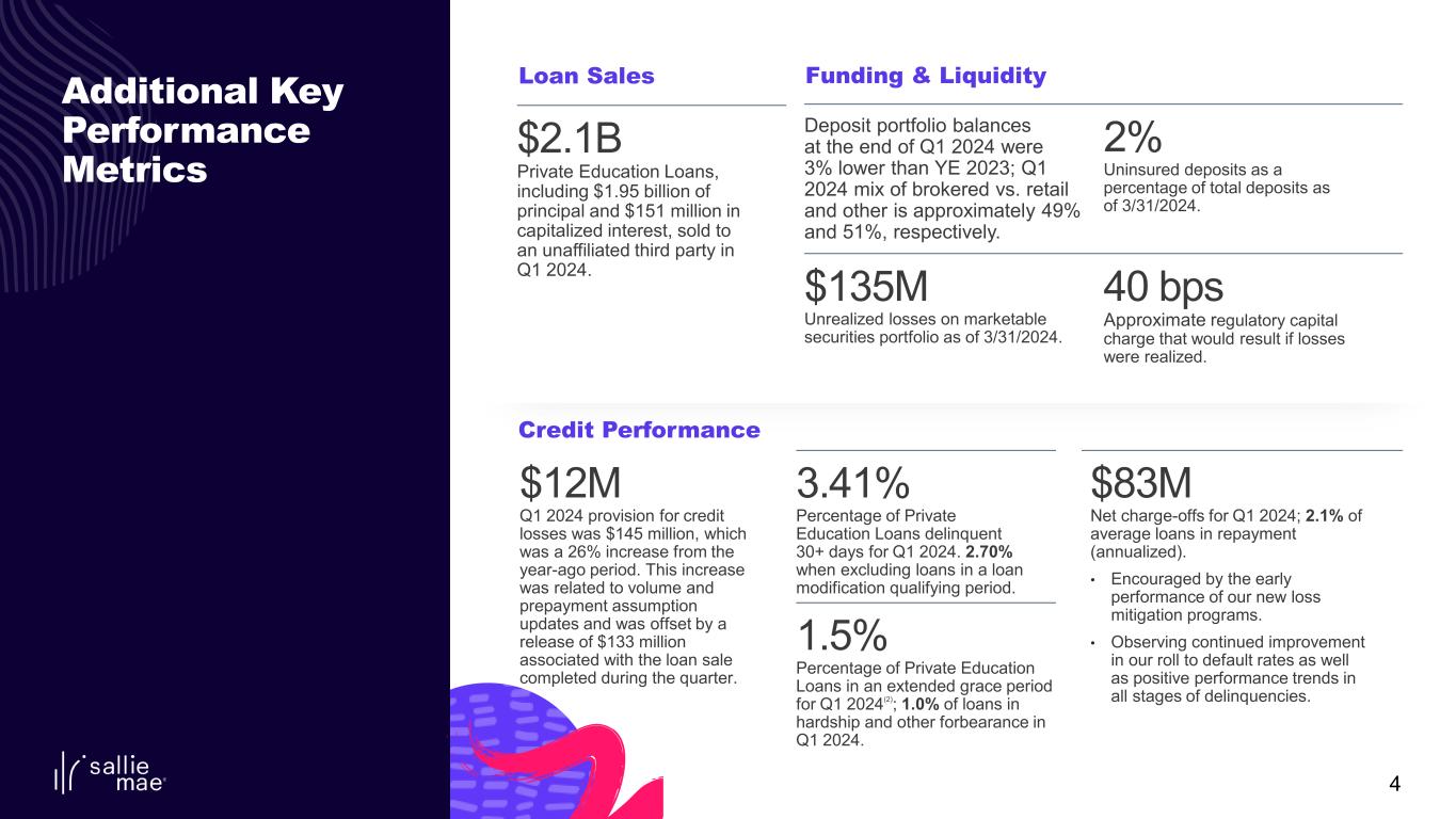 3 $285M GAAP Net Income attributable to common stock in Q1 2024. $1.27 Q1 2024 GAAP diluted earnings per common share. 5.49% Net interest margin for Q1 2024; down from 5.70% in Q1 2023. $143M Gain on sale of loans in Q1 2024; coupled with related allowance release of $133 million results in $0.92 of diluted earnings per common share. $160M Total operating expenses in Q1 2024, as compared to $155M in the year-ago quarter. 1st Quarter 2024 Highlights $2.6B Private Education Loan Originations in Q1 2024 as compared to $2.4 billion in the year-ago quarter; 6% growth year-over-year. 6.1% Private Education Loan allowance as a percentage of the ending total loan balance and accrued interest to be capitalized, down from 6.4% in the year-ago quarter. $0.11 Common stock dividend paid in Q1 2024. 66% Return on Common Equity(1), for quarter ended March 31, 2024. 13.5% Total risk-based capital ratio; CET1 capital ratio of 12.3%. 1.3M Shares repurchased in Q1 2024 under the 2024 share repurchase program at an avg. price of $20.32 per share; $623 million left under repurchase program authorization as of March 31, 2024. Balance Sheet & Capital Allocation Income Statement & Earnings Summary