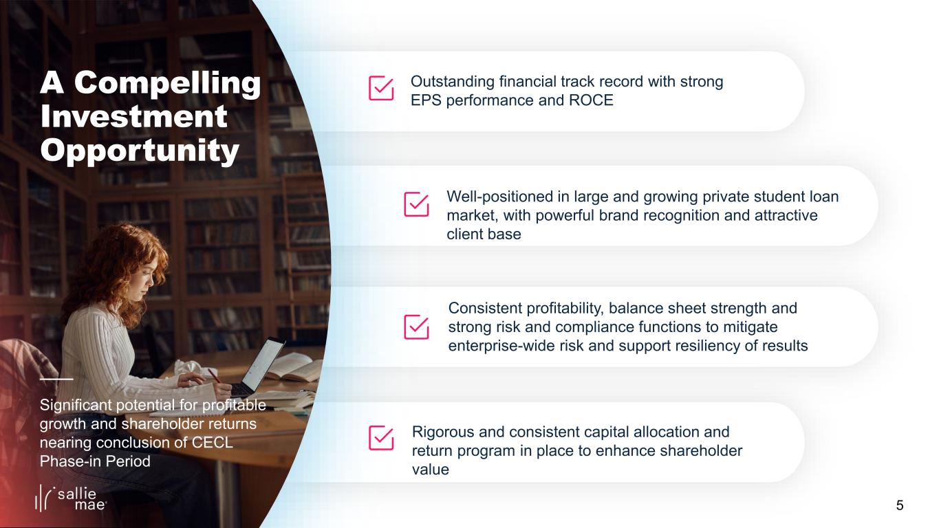 4 $12M Q1 2024 provision for credit losses was $145 million, which was a 26% increase from the year-ago period. This increase was related to volume and prepayment assumption updates and was offset by a release of $133 million associated with the loan sale completed during the quarter. 3.41% Percentage of Private Education Loans delinquent 30+ days for Q1 2024. 2.70% when excluding loans in a loan modification qualifying period. $83M Net charge-offs for Q1 2024; 2.1% of average loans in repayment (annualized). • Encouraged by the early performance of our new loss mitigation programs. • Observing continued improvement in our roll to default rates as well as positive performance trends in all stages of delinquencies. 1.5% Percentage of Private Education Loans in an extended grace period for Q1 2024(2); 1.0% of loans in hardship and other forbearance in Q1 2024. Additional Key Performance Metrics Credit Performance Deposit portfolio balances at the end of Q1 2024 were 3% lower than YE 2023; Q1 2024 mix of brokered vs. retail and other is approximately 49% and 51%, respectively. 2% Uninsured deposits as a percentage of total deposits as of 3/31/2024. $135M Unrealized losses on marketable securities portfolio as of 3/31/2024. 40 bps Approximate regulatory capital charge that would result if losses were realized. Funding & LiquidityLoan Sales $2.1B Private Education Loans, including $1.95 billion of principal and $151 million in capitalized interest, sold to an unaffiliated third party in Q1 2024.