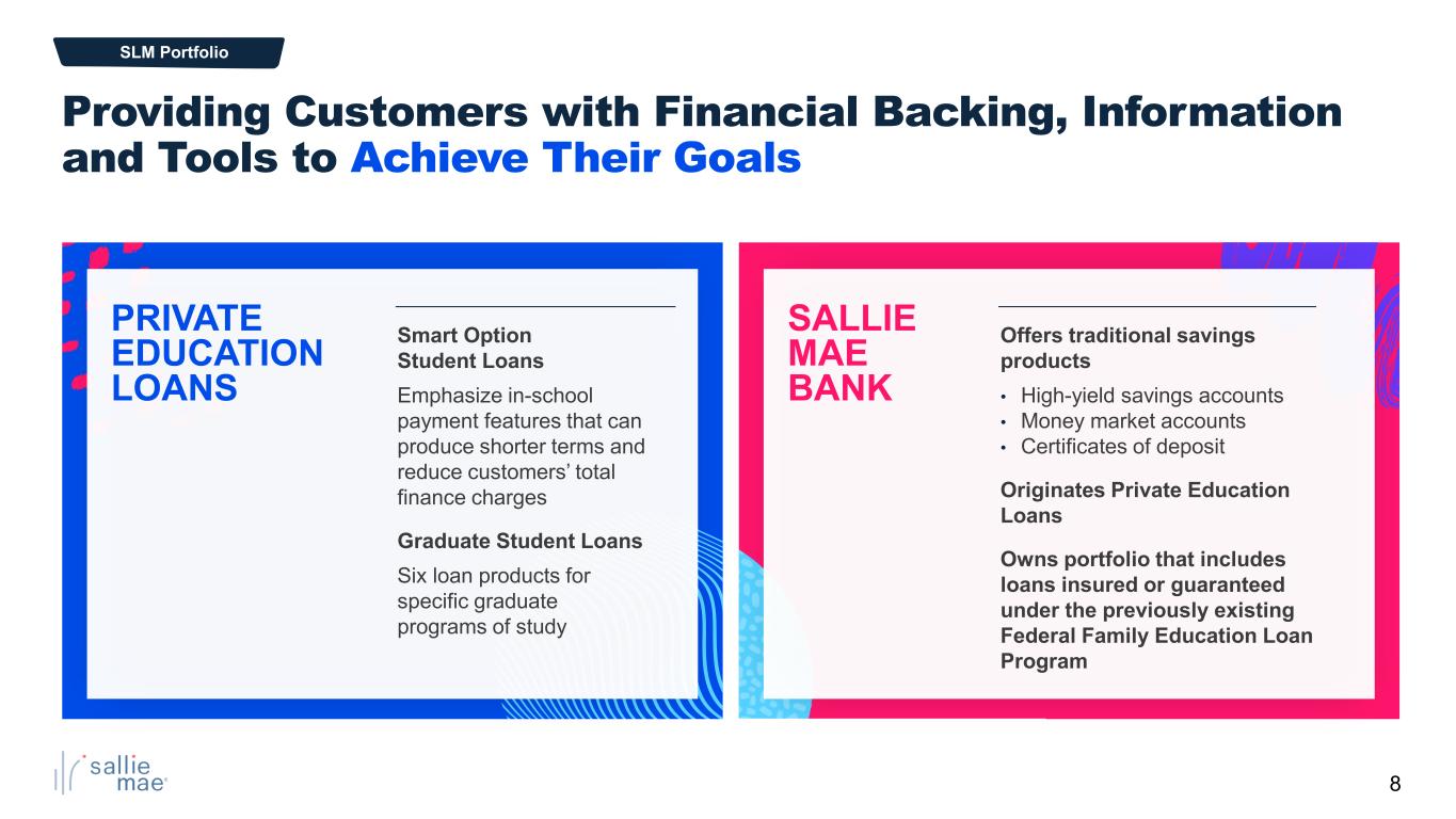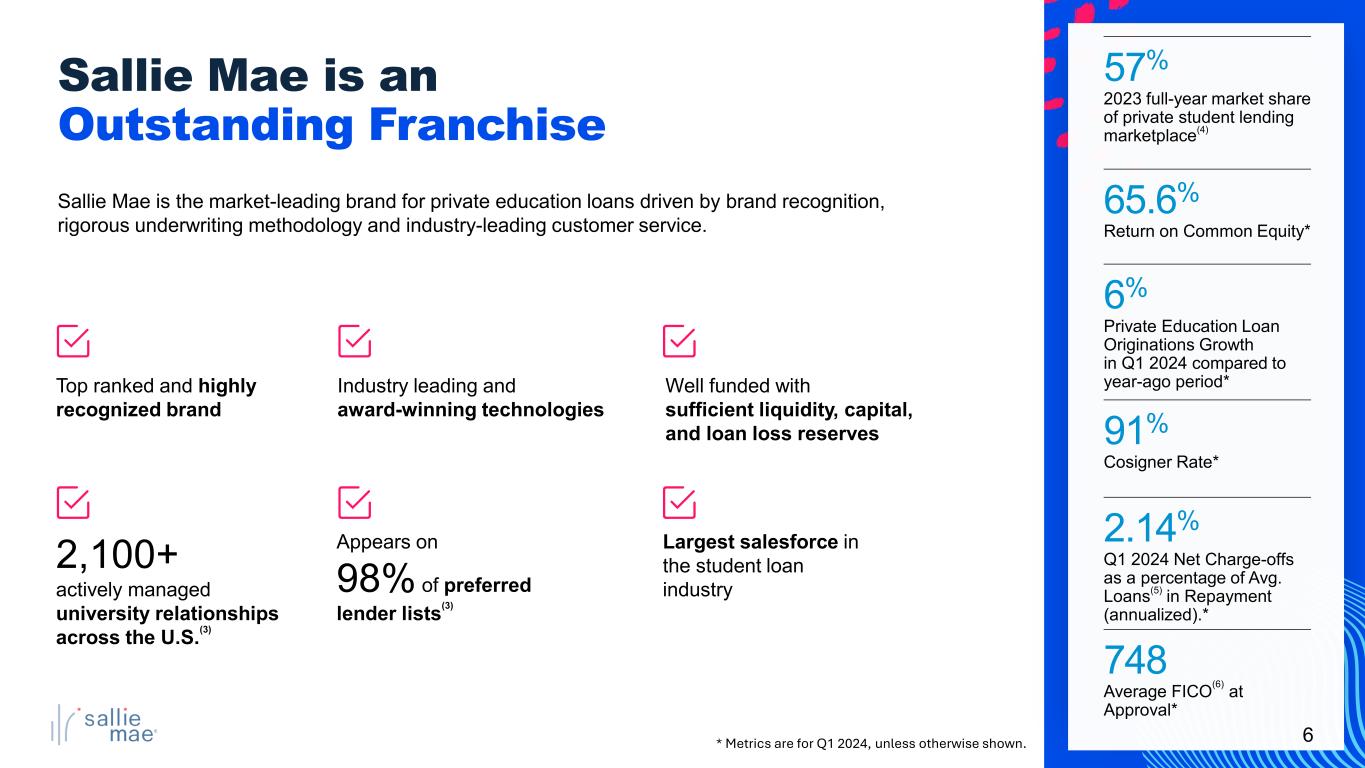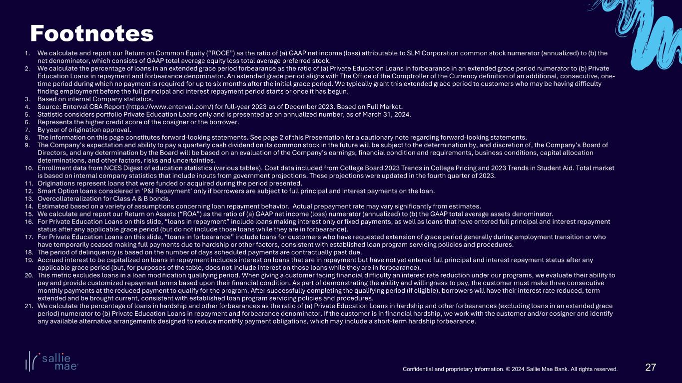 27Confidential and proprietary information. © 2024 Sallie Mae Bank. All rights reserved. 1. We calculate and report our Return on Common Equity (“ROCE”) as the ratio of (a) GAAP net income (loss) attributable to SLM Corporation common stock numerator (annualized) to (b) the net denominator, which consists of GAAP total average equity less total average preferred stock. 2. We calculate the percentage of loans in an extended grace period forbearance as the ratio of (a) Private Education Loans in forbearance in an extended grace period numerator to (b) Private Education Loans in repayment and forbearance denominator. An extended grace period aligns with The Office of the Comptroller of the Currency definition of an additional, consecutive, one- time period during which no payment is required for up to six months after the initial grace period. We typically grant this extended grace period to customers who may be having difficulty finding employment before the full principal and interest repayment period starts or once it has begun. 3. Based on internal Company statistics. 4. Source: Enterval CBA Report (https://www.enterval.com/) for full-year 2023 as of December 2023. Based on Full Market. 5. Statistic considers portfolio Private Education Loans only and is presented as an annualized number, as of March 31, 2024. 6. Represents the higher credit score of the cosigner or the borrower. 7. By year of origination approval. 8. The information on this page constitutes forward-looking statements. See page 2 of this Presentation for a cautionary note regarding forward-looking statements. 9. The Company’s expectation and ability to pay a quarterly cash dividend on its common stock in the future will be subject to the determination by, and discretion of, the Company’s Board of Directors, and any determination by the Board will be based on an evaluation of the Company’s earnings, financial condition and requirements, business conditions, capital allocation determinations, and other factors, risks and uncertainties. 10. Enrollment data from NCES Digest of education statistics (various tables). Cost data included from College Board 2023 Trends in College Pricing and 2023 Trends in Student Aid. Total market is based on internal company statistics that include inputs from government projections. These projections were updated in the fourth quarter of 2023. 11. Originations represent loans that were funded or acquired during the period presented. 12. Smart Option loans considered in ‘P&I Repayment’ only if borrowers are subject to full principal and interest payments on the loan. 13. Overcollateralization for Class A & B bonds. 14. Estimated based on a variety of assumptions concerning loan repayment behavior. Actual prepayment rate may vary significantly from estimates. 15. We calculate and report our Return on Assets (“ROA”) as the ratio of (a) GAAP net income (loss) numerator (annualized) to (b) the GAAP total average assets denominator. 16. For Private Education Loans on this slide, “loans in repayment” include loans making interest only or fixed payments, as well as loans that have entered full principal and interest repayment status after any applicable grace period (but do not include those loans while they are in forbearance). 17. For Private Education Loans on this slide, “loans in forbearance” include loans for customers who have requested extension of grace period generally during employment transition or who have temporarily ceased making full payments due to hardship or other factors, consistent with established loan program servicing policies and procedures. 18. The period of delinquency is based on the number of days scheduled payments are contractually past due. 19. Accrued interest to be capitalized on loans in repayment includes interest on loans that are in repayment but have not yet entered full principal and interest repayment status after any applicable grace period (but, for purposes of the table, does not include interest on those loans while they are in forbearance). 20. This metric excludes loans in a loan modification qualifying period. When giving a customer facing financial difficulty an interest rate reduction under our programs, we evaluate their ability to pay and provide customized repayment terms based upon their financial condition. As part of demonstrating the ability and willingness to pay, the customer must make three consecutive monthly payments at the reduced payment to qualify for the program. After successfully completing the qualifying period (if eligible), borrowers will have their interest rate reduced, term extended and be brought current, consistent with established loan program servicing policies and procedures. 21. We calculate the percentage of loans in hardship and other forbearances as the ratio of (a) Private Education Loans in hardship and other forbearances (excluding loans in an extended grace period) numerator to (b) Private Education Loans in repayment and forbearance denominator. If the customer is in financial hardship, we work with the customer and/or cosigner and identify any available alternative arrangements designed to reduce monthly payment obligations, which may include a short-term hardship forbearance. Footnotes
