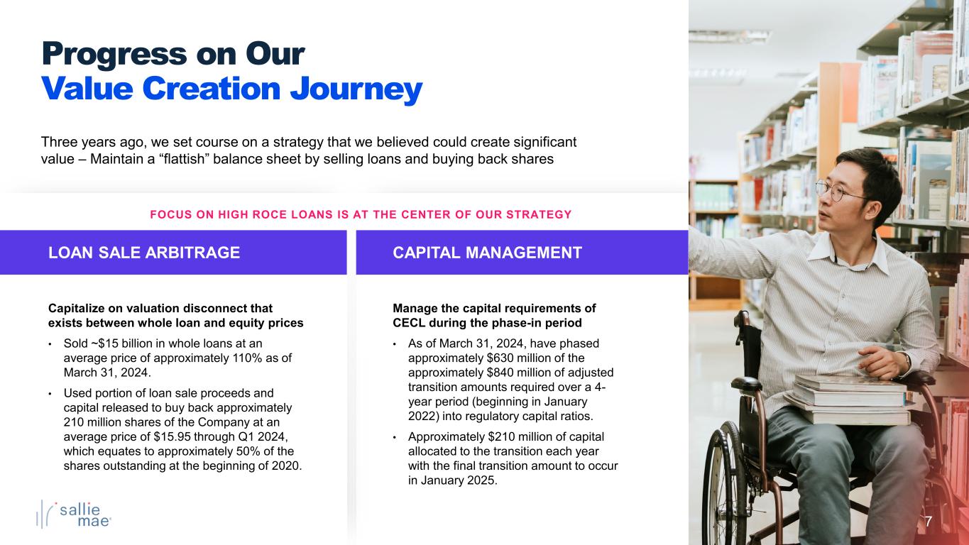 6 57% 2023 full-year market share of private student lending marketplace(4) 65.6% Return on Common Equity* 6% Private Education Loan Originations Growth in Q1 2024 compared to year-ago period* 91% Cosigner Rate* 2.14% Q1 2024 Net Charge-offs as a percentage of Avg. Loans(5) in Repayment (annualized).* 748 Average FICO(6) at Approval* Top ranked and highly recognized brand Industry leading and award-winning technologies Well funded with sufficient liquidity, capital, and loan loss reserves Sallie Mae is the market-leading brand for private education loans driven by brand recognition, rigorous underwriting methodology and industry-leading customer service. 2,100+ actively managed university relationships across the U.S.(3) Appears on 98% of preferred lender lists(3) Largest salesforce in the student loan industry Sallie Mae is an Outstanding Franchise * Metrics are for Q1 2024, unless otherwise shown.