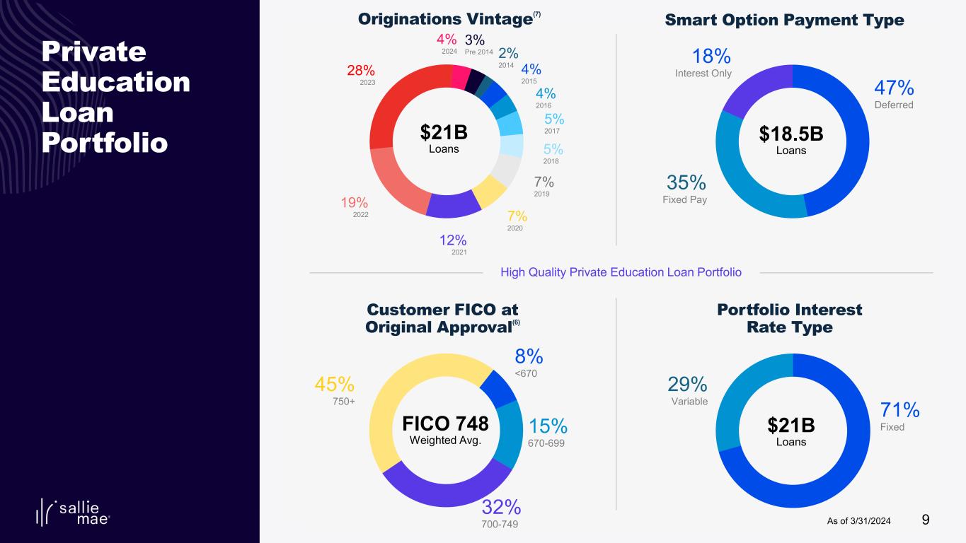8 Providing Customers with Financial Backing, Information and Tools to Achieve Their Goals SALLIE MAE BANK Offers traditional savings products • High-yield savings accounts • Money market accounts • Certificates of deposit Originates Private Education Loans Owns portfolio that includes loans insured or guaranteed under the previously existing Federal Family Education Loan Program PRIVATE EDUCATION LOANS Smart Option Student Loans Emphasize in-school payment features that can produce shorter terms and reduce customers’ total finance charges Graduate Student Loans Six loan products for specific graduate programs of study SLM Portfolio