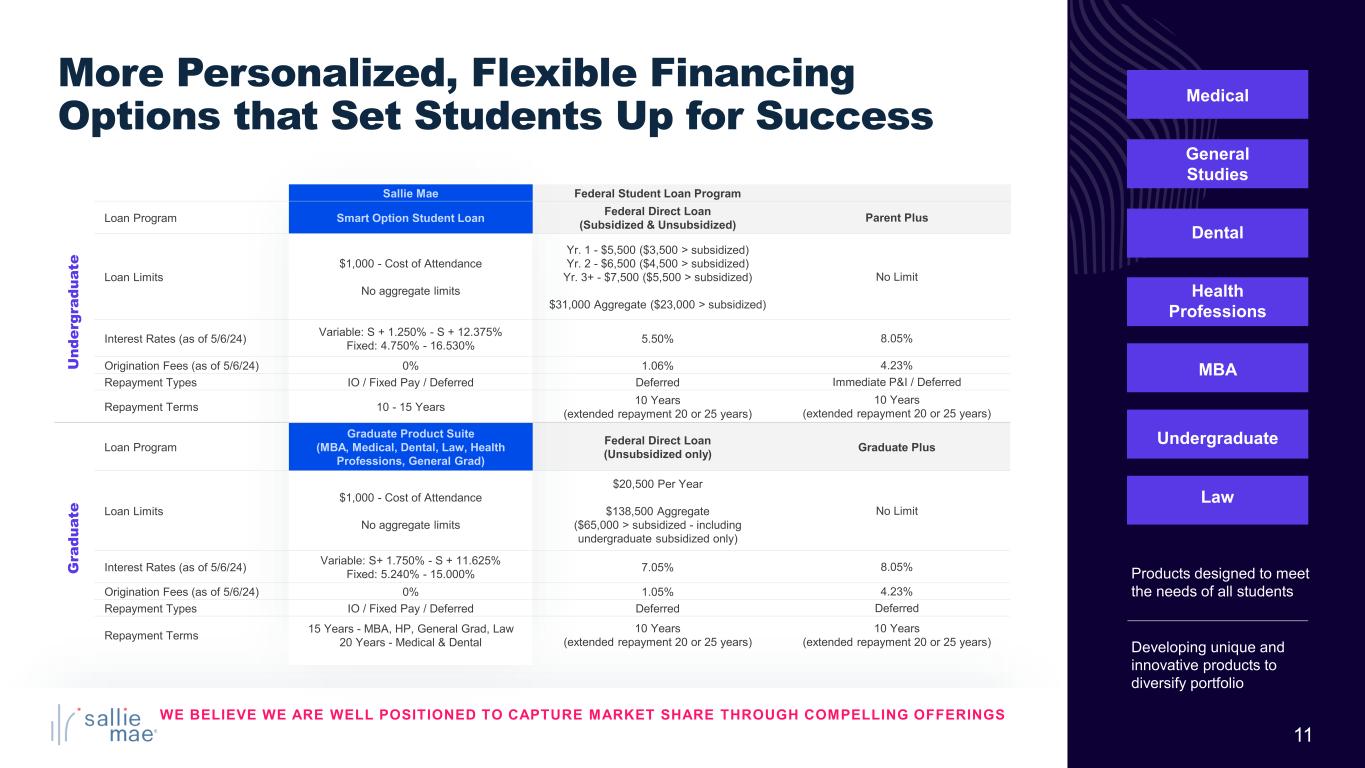 10 Interest Only loans Require full interest payments during in-school, grace, and deferment periods Fixed Pay loans Require $25 fixed payments during in-school, grace, and deferment periods Deferred loans Do not require payments during in-school and grace periods The Smart Option Loan product, introduced in 2009, consists of: Sallie Mae’s Smart Option Loan • Smart Option payment option may not be changed after selected at origination • Fixed-rate loans or variable- rate loans • Consumer credit underwriting, with minimum FICO, custom credit score model and judgmental underwriting • Marketed primarily through the school channel and also directly to consumers, with all loansA certified by and disbursed directly to schools • Qualified education loans are non- dischargeable in bankruptcy, unless a borrower can prove that repayment of the loan would impose an "undue hardship” A Bar Study, and Residency and Relocation loans are exceptions.
