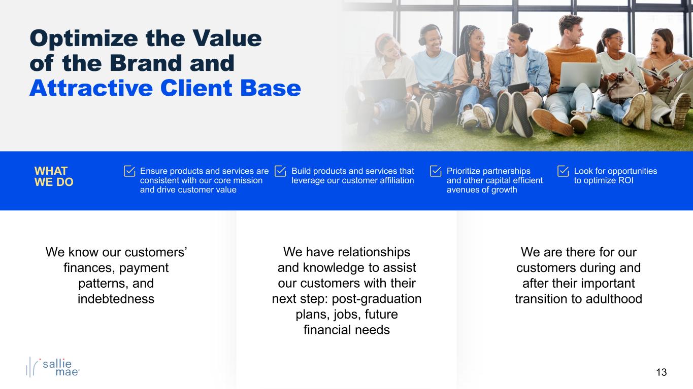 12 STRATEGIES TO MAXIMIZE REVENUE STRATEGIES TO MANAGE UNIT COSTS Our Proven Strategy Aims to Maximize the Profitability and Growth of the Core Business Drive penetration at all schools Increase market share by bridging gaps in student funding needs Enhance risk-adjusted pricing and underwriting Improve marketing, digital, and data capabilities Maintain strong focus on fixed cost discipline Drive towards reducing both the unit cost of servicing and the unit cost of acquisitions Improve third-party vendor cost management Drive towards strong operating leverage