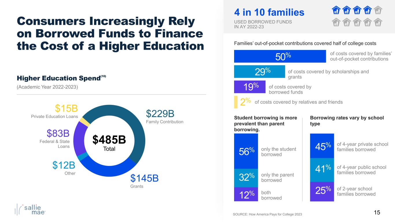 15 Consumers Increasingly Rely on Borrowed Funds to Finance the Cost of a Higher Education 4 in 10 families Student borrowing is more prevalent than parent borrowing. Borrowing rates vary by school type USED BORROWED FUNDS IN AY 2022-23 SOURCE: How America Pays for College 2023 Families’ out-of-pocket contributions covered half of college costs $229B Family Contribution $145B Grants $12B Other $15B Private Education Loans Higher Education Spend(10) (Academic Year 2022-2023) $83B Federal & State Loans $485B Total 56% only the student borrowed 32% only the parent borrowed 12% both borrowed 45% of 4-year private school families borrowed 41% of 4-year public school families borrowed 25% of 2-year school families borrowed of costs covered by families’ out-of-pocket contributions of costs covered by scholarships and grants of costs covered by borrowed funds of costs covered by relatives and friends 50% 29% 19% 2%