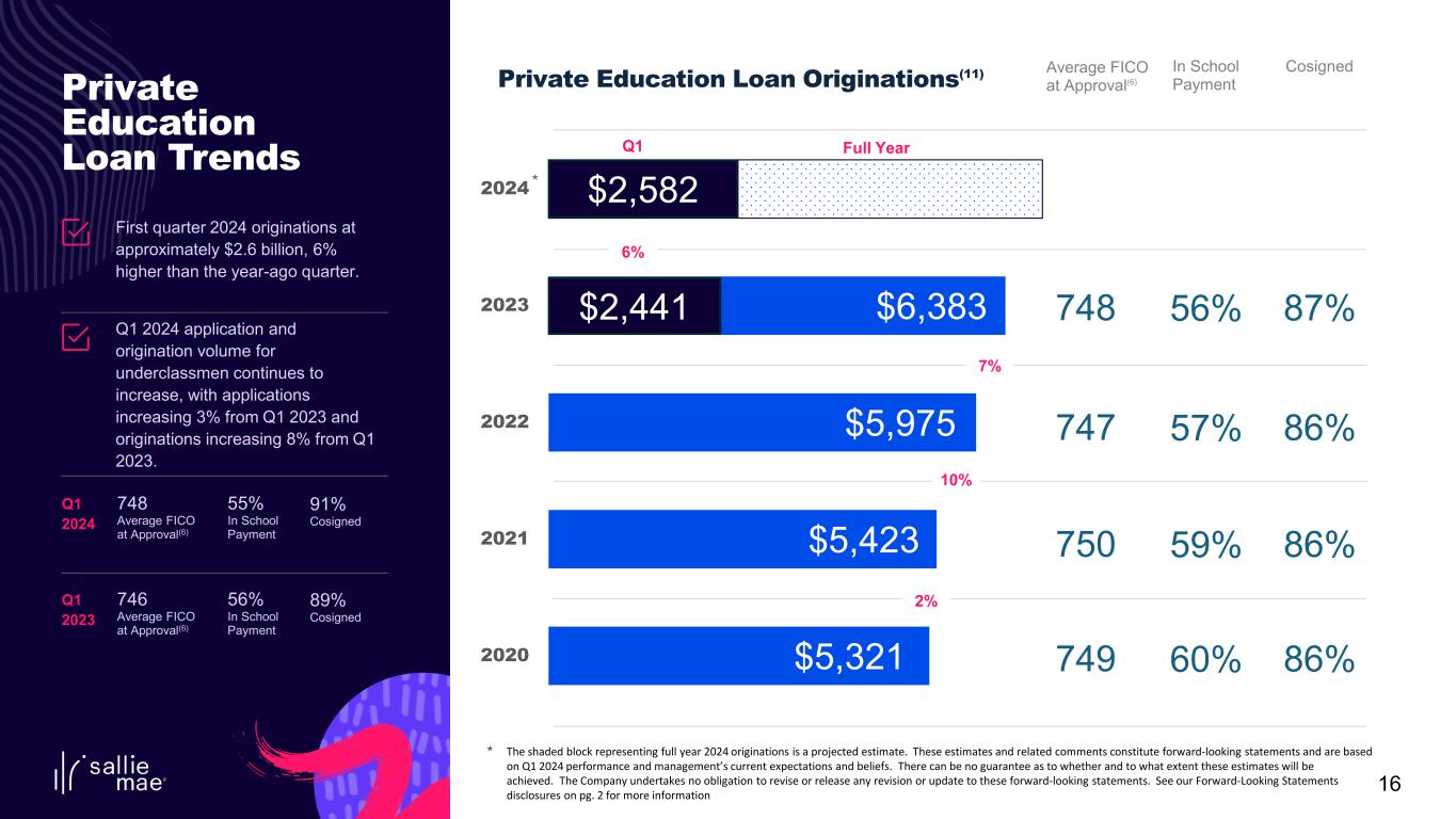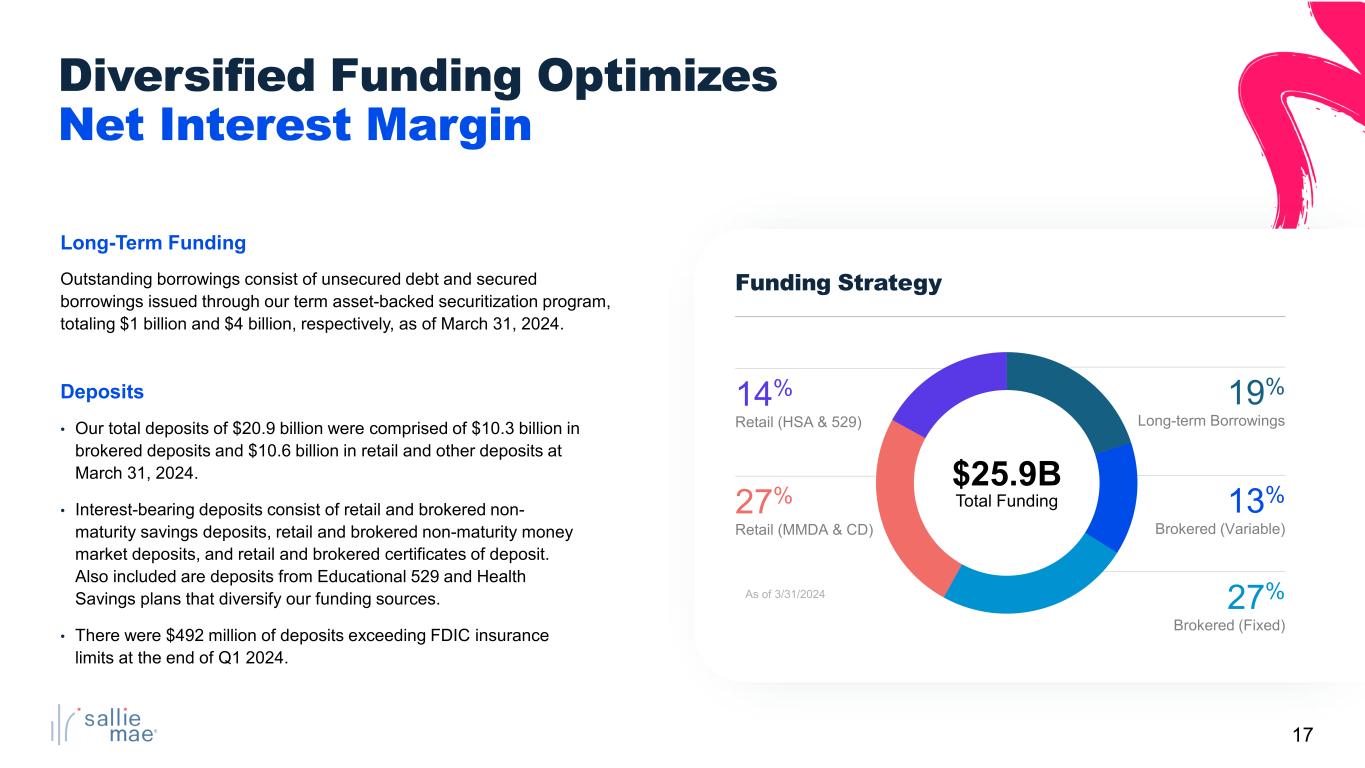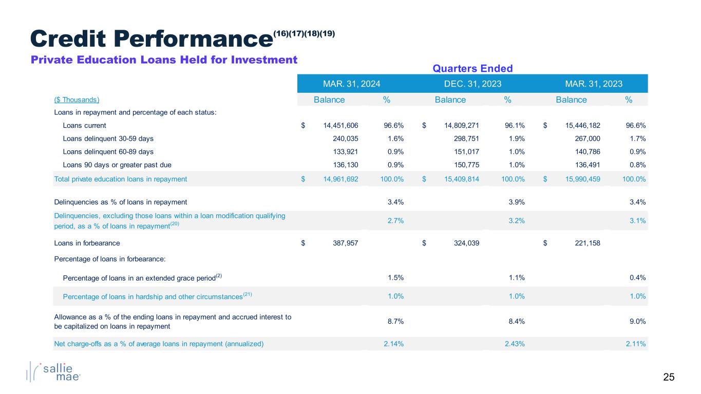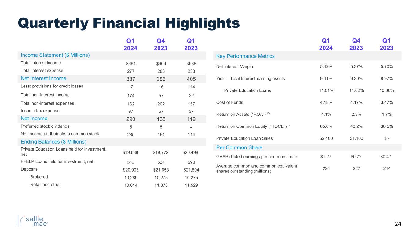 24 Q1 2024 Q4 2023 Q1 2023 Income Statement ($ Millions) Total interest income $664 $669 $638 Total interest expense 277 283 233 Net Interest Income 387 386 405 Less: provisions for credit losses 12 16 114 Total non-interest income 174 57 22 Total non-interest expenses 162 202 157 Income tax expense 97 57 37 Net Income 290 168 119 Preferred stock dividends 5 5 4 Net income attributable to common stock 285 164 114 Ending Balances ($ Millions) Private Education Loans held for investment, net $19,688 $19,772 $20,498 FFELP Loans held for investment, net 513 534 590 Deposits $20,903 $21,653 $21,804 Brokered 10,289 10,275 10,275 Retail and other 10,614 11,378 11,529 Q1 2024 Q4 2023 Q1 2023 Key Performance Metrics Net Interest Margin 5.49% 5.37% 5.70% Yield—Total Interest-earning assets 9.41% 9.30% 8.97% Private Education Loans 11.01% 11.02% 10.66% Cost of Funds 4.18% 4.17% 3.47% Return on Assets (“ROA”)(15) 4.1% 2.3% 1.7% Return on Common Equity (“ROCE”)(1) 65.6% 40.2% 30.5% Private Education Loan Sales $2,100 $1,100 $ - Per Common Share GAAP diluted earnings per common share $1.27 $0.72 $0.47 Average common and common equivalent shares outstanding (millions) 224 227 244 Quarterly Financial Highlights
