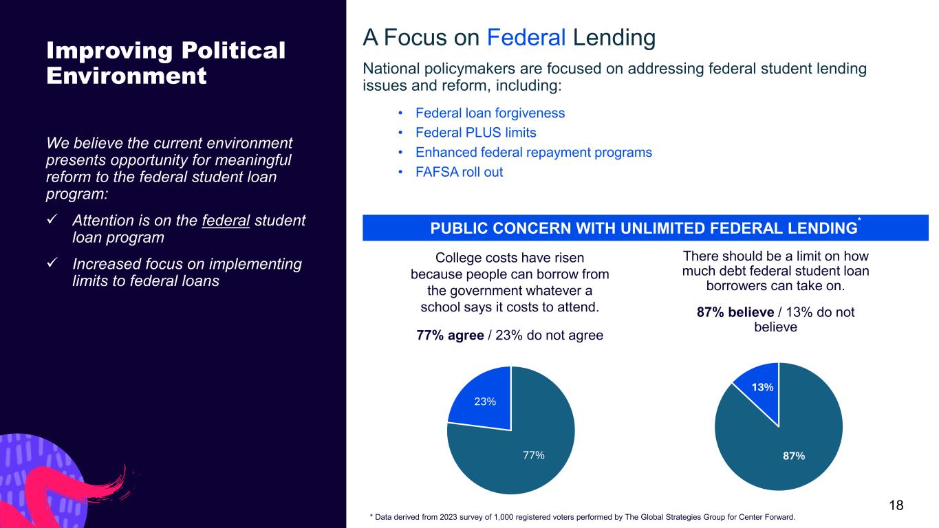 18 Improving Political Environment A Focus on Federal Lending National policymakers are focused on addressing federal student lending issues and reform, including: • Federal loan forgiveness • Federal PLUS limits • Enhanced federal repayment programs • FAFSA roll out We believe the current environment presents opportunity for meaningful reform to the federal student loan program: Attention is on the federal student loan program Increased focus on implementing limits to federal loans 77% 23% 87% 13% There should be a limit on how much debt federal student loan borrowers can take on. 87% believe / 13% do not believe * Data derived from 2023 survey of 1,000 registered voters performed by The Global Strategies Group for Center Forward. College costs have risen because people can borrow from the government whatever a school says it costs to attend. 77% agree / 23% do not agree PUBLIC CONCERN WITH UNLIMITED FEDERAL LENDING*