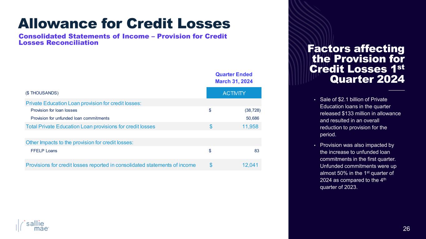 25 Credit Performance(16)(17)(18)(19) Private Education Loans Held for Investment ($ Thousands) Balance % Balance % Balance % Loans in repayment and percentage of each status: Loans current 14,451,606$ 96.6% 14,809,271$ 96.1% 15,446,182$ 96.6% Loans delinquent 30-59 days 240,035 1.6% 298,751 1.9% 267,000 1.7% Loans delinquent 60-89 days 133,921 0.9% 151,017 1.0% 140,786 0.9% Loans 90 days or greater past due 136,130 0.9% 150,775 1.0% 136,491 0.8% Total private education loans in repayment 14,961,692$ 100.0% 15,409,814$ 100.0% 15,990,459$ 100.0% Delinquencies as % of loans in repayment 3.4% 3.9% 3.4% Delinquencies, excluding those loans within a loan modification qualifying period, as a % of loans in repayment(20) 2.7% 3.2% 3.1% Loans in forbearance 387,957$ 324,039$ 221,158$ Percentage of loans in forbearance: Percentage of loans in an extended grace period(2) 1.5% 1.1% 0.4% Percentage of loans in hardship and other circumstances(21) 1.0% 1.0% 1.0% Allowance as a % of the ending loans in repayment and accrued interest to be capitalized on loans in repayment 8.7% 8.4% 9.0% Net charge-offs as a % of average loans in repayment (annualized) 2.14% 2.43% 2.11% MAR. 31, 2024 DEC. 31, 2023 MAR. 31, 2023 Quarters Ended