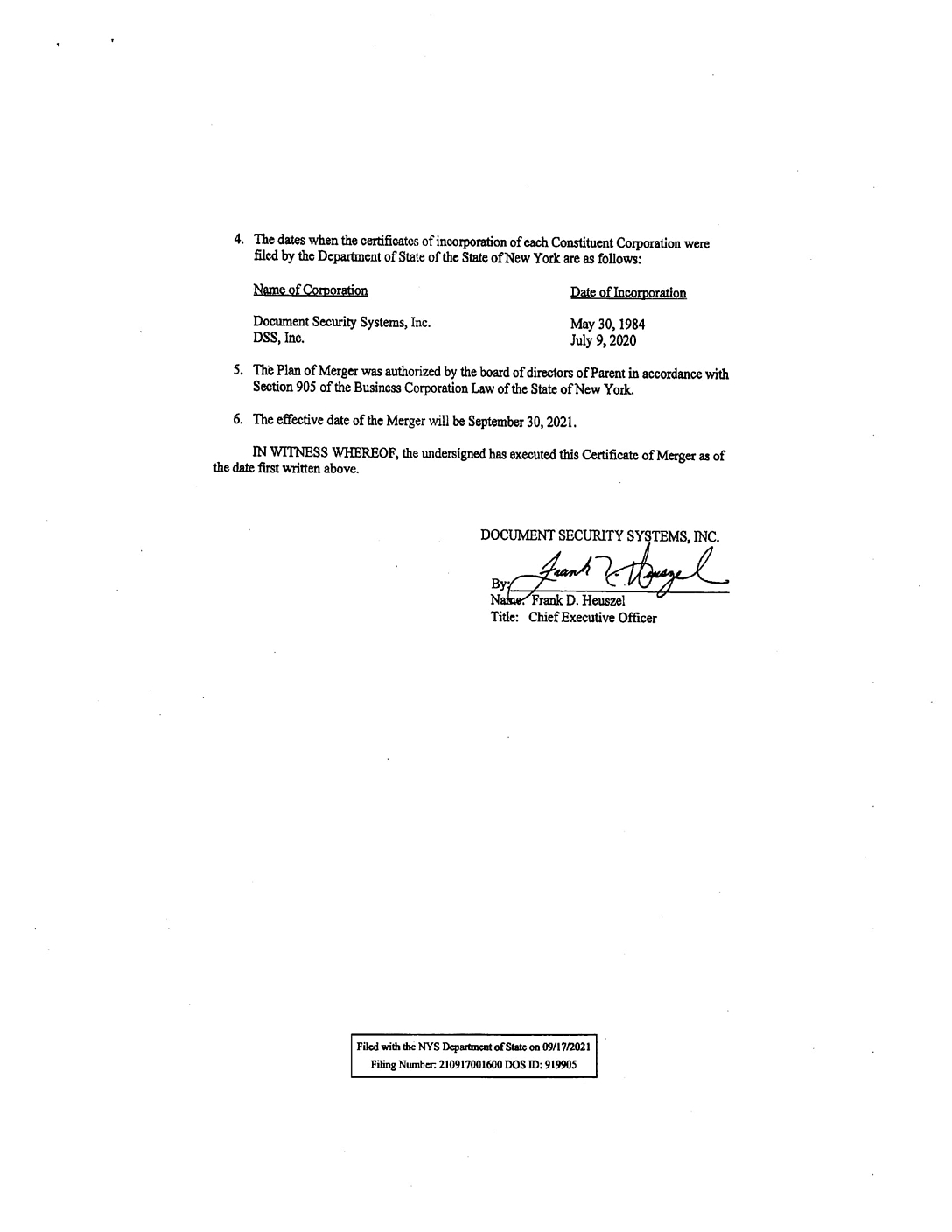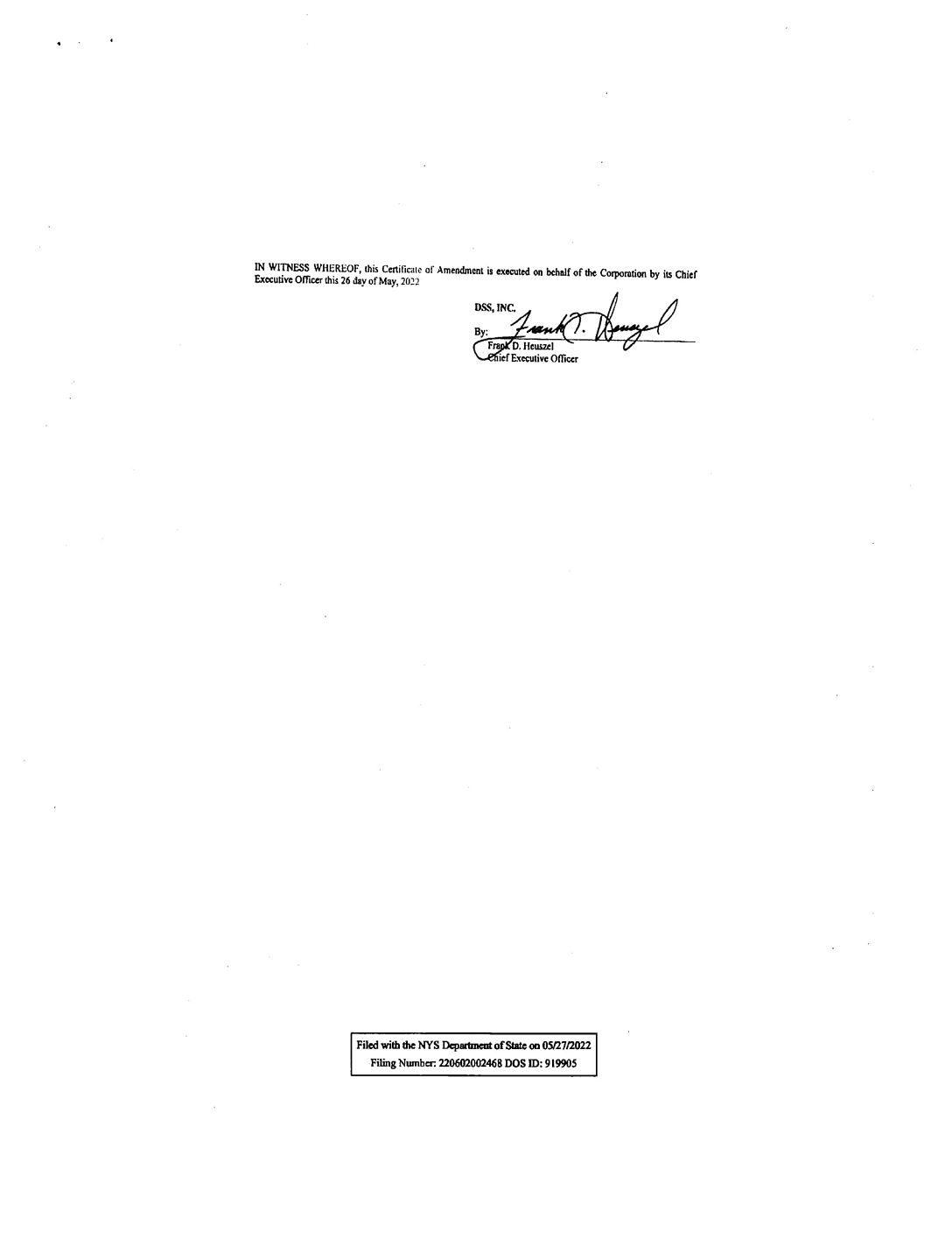 In connection with the Quarterly Report of DSS, Inc. (the “Company”) on Form 10-Q for the quarter ended March 31, 2024 as filed with the Securities and Exchange Commission on the date hereof (the “Report”), I, Frank D. Heuszel Chief Executive Officer of the Company hereby certify, pursuant to 18 U.S.C. Section 1350, as adopted pursuant to section 906 of the Sarbanes-Oxley Act of 2002, that to the best of my knowledge: