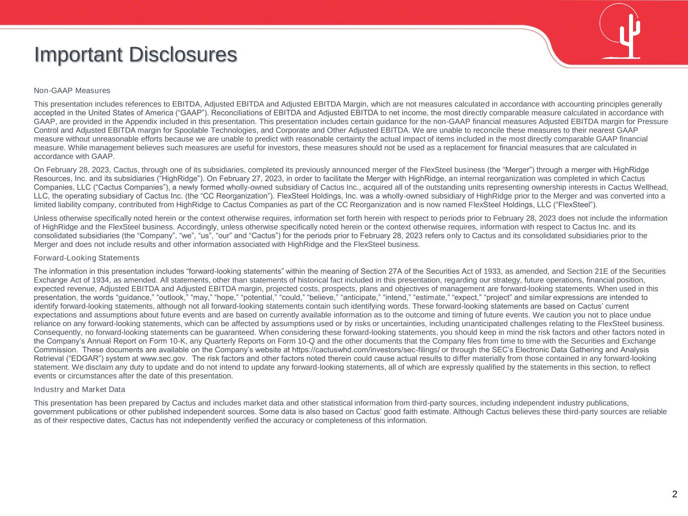 2 Non-GAAP Measures This presentation includes references to EBITDA, Adjusted EBITDA and Adjusted EBITDA Margin, which are not measures calculated in accordance with accounting principles generally accepted in the United States of America (“GAAP”). Reconciliations of EBITDA and Adjusted EBITDA to net income, the most directly comparable measure calculated in accordance with GAAP, are provided in the Appendix included in this presentation. This presentation includes certain guidance for the non-GAAP financial measures Adjusted EBITDA margin for Pressure Control and Adjusted EBITDA margin for Spoolable Technologies, and Corporate and Other Adjusted EBITDA. We are unable to reconcile these measures to their nearest GAAP measure without unreasonable efforts because we are unable to predict with reasonable certainty the actual impact of items included in the most directly comparable GAAP financial measure. While management believes such measures are useful for investors, these measures should not be used as a replacement for financial measures that are calculated in accordance with GAAP. On February 28, 2023, Cactus, through one of its subsidiaries, completed its previously announced merger of the FlexSteel business (the “Merger”) through a merger with HighRidge Resources, Inc. and its subsidiaries (“HighRidge”). On February 27, 2023, in order to facilitate the Merger with HighRidge, an internal reorganization was completed in which Cactus Companies, LLC (“Cactus Companies”), a newly formed wholly-owned subsidiary of Cactus Inc., acquired all of the outstanding units representing ownership interests in Cactus Wellhead, LLC, the operating subsidiary of Cactus Inc. (the “CC Reorganization”). FlexSteel Holdings, Inc. was a wholly-owned subsidiary of HighRidge prior to the Merger and was converted into a limited liability company, contributed from HighRidge to Cactus Companies as part of the CC Reorganization and is now named FlexSteel Holdings, LLC (“FlexSteel”). Unless otherwise specifically noted herein or the context otherwise requires, information set forth herein with respect to periods prior to February 28, 2023 does not include the information of HighRidge and the FlexSteel business. Accordingly, unless otherwise specifically noted herein or the context otherwise requires, information with respect to Cactus Inc. and its consolidated subsidiaries (the “Company”, “we”, “us”, “our” and “Cactus”) for the periods prior to February 28, 2023 refers only to Cactus and its consolidated subsidiaries prior to the Merger and does not include results and other information associated with HighRidge and the FlexSteel business. Forward-Looking Statements The information in this presentation includes “forward-looking statements” within the meaning of Section 27A of the Securities Act of 1933, as amended, and Section 21E of the Securities Exchange Act of 1934, as amended. All statements, other than statements of historical fact included in this presentation, regarding our strategy, future operations, financial position, expected revenue, Adjusted EBITDA and Adjusted EBITDA margin, projected costs, prospects, plans and objectives of management are forward-looking statements. When used in this presentation, the words “guidance,” “outlook,” “may,” “hope,” “potential,” “could,” “believe,” “anticipate,” “intend,” “estimate,” “expect,” “project” and similar expressions are intended to identify forward-looking statements, although not all forward-looking statements contain such identifying words. These forward-looking statements are based on Cactus’ current expectations and assumptions about future events and are based on currently available information as to the outcome and timing of future events. We caution you not to place undue reliance on any forward-looking statements, which can be affected by assumptions used or by risks or uncertainties, including unanticipated challenges relating to the FlexSteel business. Consequently, no forward-looking statements can be guaranteed. When considering these forward-looking statements, you should keep in mind the risk factors and other factors noted in the Company’s Annual Report on Form 10-K, any Quarterly Reports on Form 10-Q and the other documents that the Company files from time to time with the Securities and Exchange Commission. These documents are available on the Company’s website at https://cactuswhd.com/investors/sec-filings/ or through the SEC’s Electronic Data Gathering and Analysis Retrieval (“EDGAR”) system at www.sec.gov. The risk factors and other factors noted therein could cause actual results to differ materially from those contained in any forward-looking statement. We disclaim any duty to update and do not intend to update any forward-looking statements, all of which are expressly qualified by the statements in this section, to reflect events or circumstances after the date of this presentation. Industry and Market Data This presentation has been prepared by Cactus and includes market data and other statistical information from third-party sources, including independent industry publications, government publications or other published independent sources. Some data is also based on Cactus’ good faith estimate. Although Cactus believes these third-party sources are reliable as of their respective dates, Cactus has not independently verified the accuracy or completeness of this information. Important Disclosures
