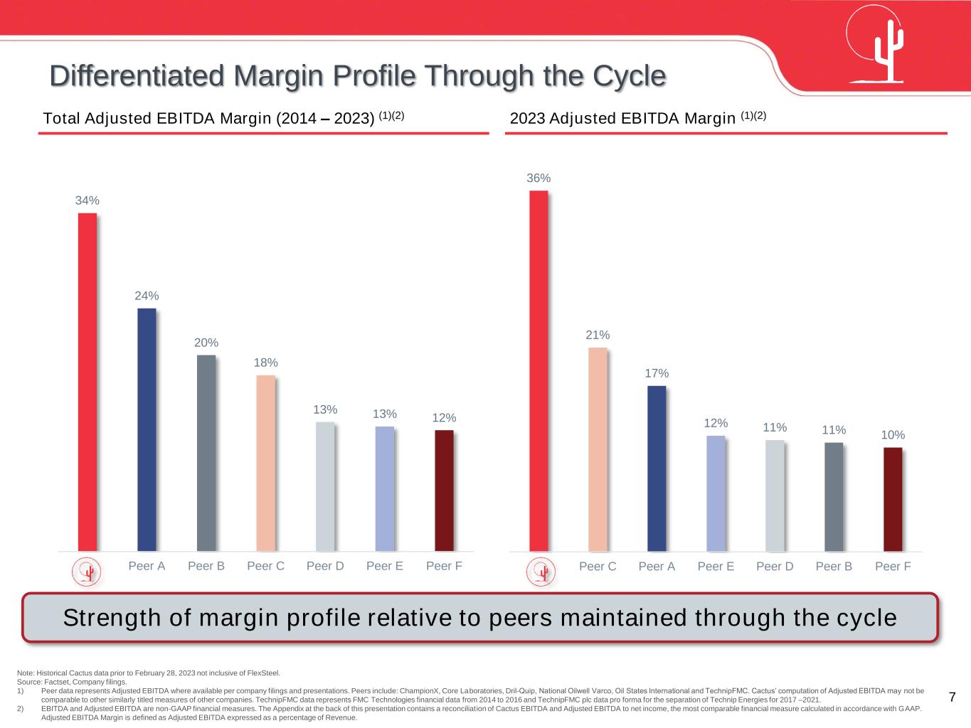6 36% 35% 27% 33% 36% 35% $757 $700 $340 $396 $628 $349 $439 $688 $1,097 $1,096 2019 2020 2021 2022 2023 Q1 2024 Ann. Revenue(1) ($ in millions) Historical Financial Overview Source: Company filings. Note: Historical financial data prior to March 2023 shown not inclusive of FlexSteel, which was acquired on Feb 28, 2023. 1) Q1 2024 Ann. represents first quarter 2024 results annualized. 2023 revenue includes Spoolable Technologies revenue from the close of the FlexSteel acquisition on February 28, 2023. 2) 2023 Adj. EBITDA includes Spoolable Technologies results from the close of the FlexSteel acquisition on February 28, 2023. EBITDA and Adjusted EBITDA are non-GAAP financial measures. The Appendix at the back of this presentation contains a reconciliation of EBITDA and Adjusted EBITDA to net income, the most comparable financial measure calculated in accordance with GAAP. 3) Net Capital Expenditures equals net cash flows from investing activities excluding cash outflow for the acquisition of FlexSteel. Adjusted EBITDA(2) – Net Capital Expenditures(3) as % of Revenue 33.4% Margin 37.1% Margin Adjusted EBITDA(1,2) ($ in millions) Adj. EBITDA(2) as % of Revenue $229 $121 $120 $228 $398 $381 2019 2020 2021 2022 2023 Q1 2024 Ann. Pressure Control 64% Spoolable Technologies 36% Q1’24 Ann.(1) Rev. by Segment ◼ Bakken ◼ Eagle Ford ◼ Permian ◼ SCOOP/STACK Selected Active Basins ◼ DJ / Powder River ◼ Marcellus / Utica ◼ Haynesville ◼ Cooper, Australia 28% 30% 25% 29% 33% 32% 2019 2020 2021 2022 2023 Q1 2024 Ann. 10 Months of Spoolable Technologies 10 months of Spoolable Technologies
