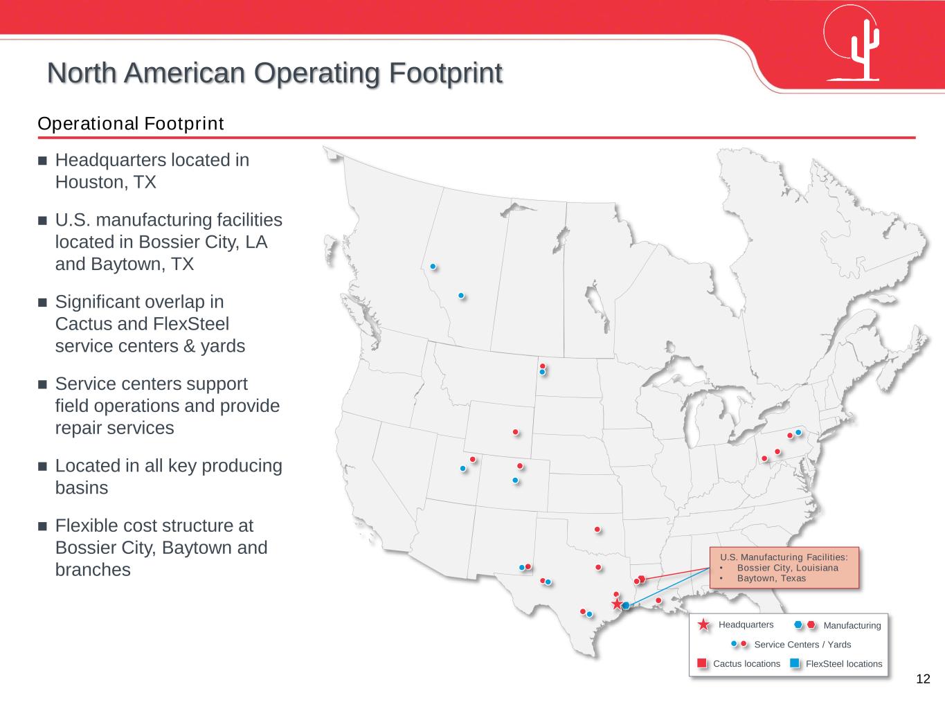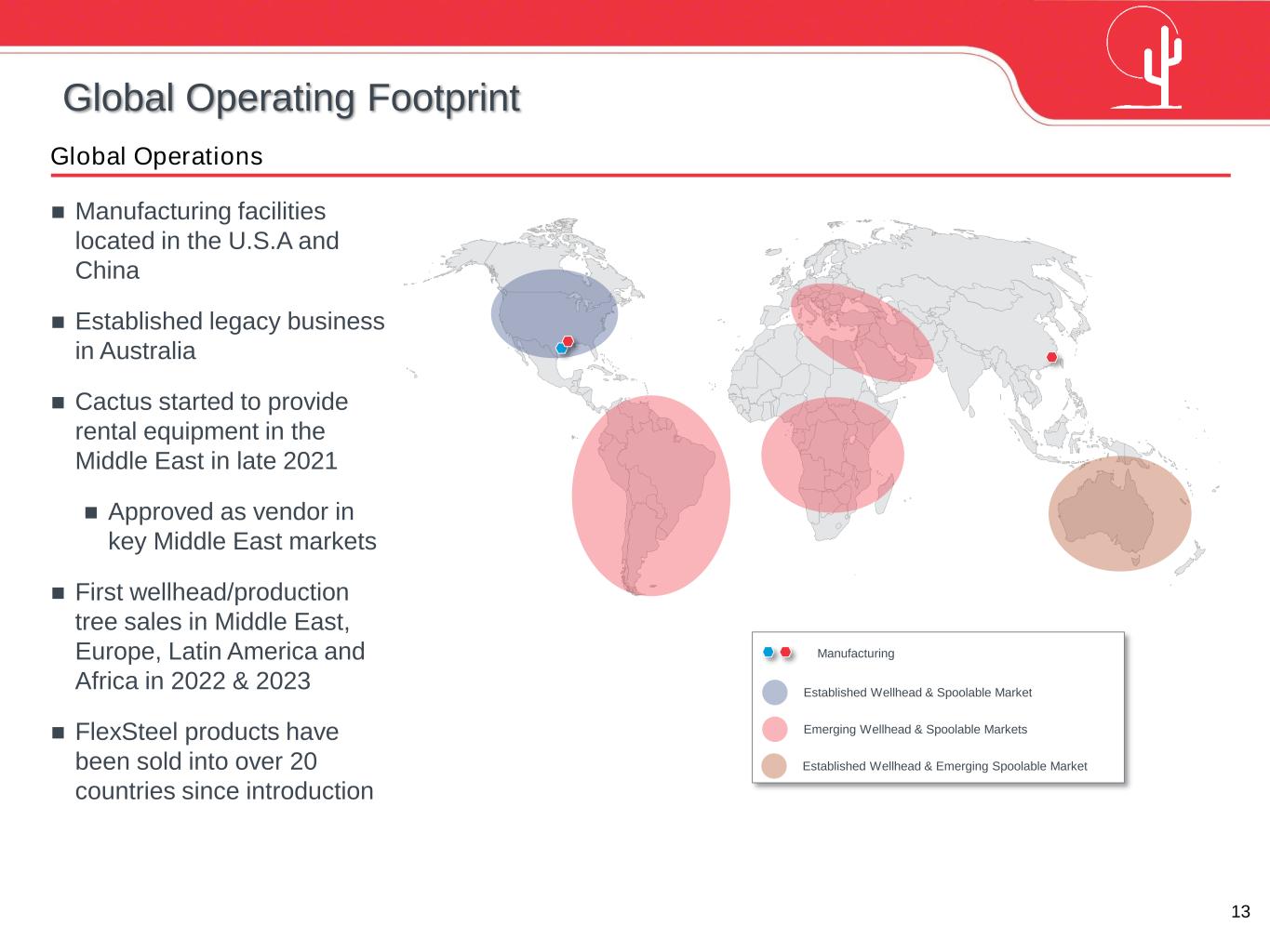 12 ◼ Headquarters located in Houston, TX ◼ U.S. manufacturing facilities located in Bossier City, LA and Baytown, TX ◼ Significant overlap in Cactus and FlexSteel service centers & yards ◼ Service centers support field operations and provide repair services ◼ Located in all key producing basins ◼ Flexible cost structure at Bossier City, Baytown and branches Operational Footprint North American Operating Footprint U.S. Manufacturing Facilities: • Bossier City, Louisiana • Baytown, Texas Headquarters Manufacturing Service Centers / Yards Cactus locations FlexSteel locations