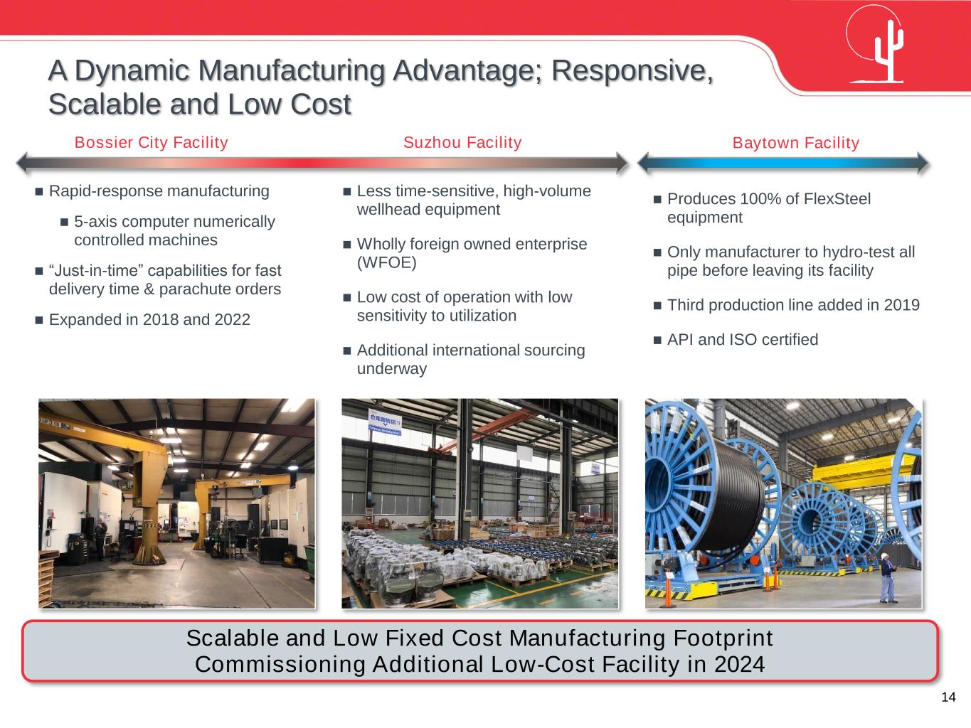 13 Global Operations ◼ Manufacturing facilities located in the U.S.A and China ◼ Established legacy business in Australia ◼ Cactus started to provide rental equipment in the Middle East in late 2021 ◼ Approved as vendor in key Middle East markets ◼ First wellhead/production tree sales in Middle East, Europe, Latin America and Africa in 2022 & 2023 ◼ FlexSteel products have been sold into over 20 countries since introduction Global Operating Footprint Established Wellhead & Spoolable Market Emerging Wellhead & Spoolable Markets Manufacturing Established Wellhead & Emerging Spoolable Market