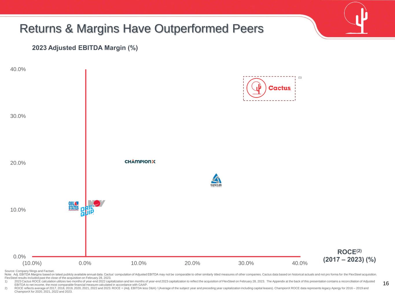 15 Current ◼ Management is well incentivized as it owns approximately 17% of the business ◼ Performance-based stock compensation tied to Return on Capital Employed (“ROCE”) ◼ Management team has built the foundation of this company over more than four decades ◼ Track record of building and successfully monetizing similar businesses ◼ Strength of leadership and loyalty is attested by management and operating teams that joined from past ventures ICC sold to Cooper Cameron Corporation (1996) Scott Bender appointed President of Cactus Wellhead Equipment (“CWE”), a subsidiary of Cactus Pipe (1977) Cactus Pipe founded (1959) CWE Merges with Ingram Petroleum Services, forming Ingram Cactus Company (“ICC”) ◼ Scott and Joel Bender become President and VP Operations, respectively, of ICC (1986) Joel Bender appointed Vice President of CWE (1984) Scott and Joel Bender appointed President and SVP, respectively, of Wood Group Pressure Control (“WGPC”) Scott Bender leaves WGPC (2010) Scott and Joel Bender found Cactus LLC with 18 key managers (2011) WGPC Sold to GE Oil and Gas (2011) Steven Bender appointed Rental Business Manager of WGPC (2005) Cactus, Inc. IPO (2018) Cactus, Inc. initiates regular quarterly dividend (2019) 19801975 1985 1990 1995 2000 2005 2010 20151959 Experienced and Well Aligned Management Team with Strong Industry Relationships 2020 Cactus, Inc. acquires FlexSteel (2023) Cactus, Inc. announces inaugural share repurchase program (2023)