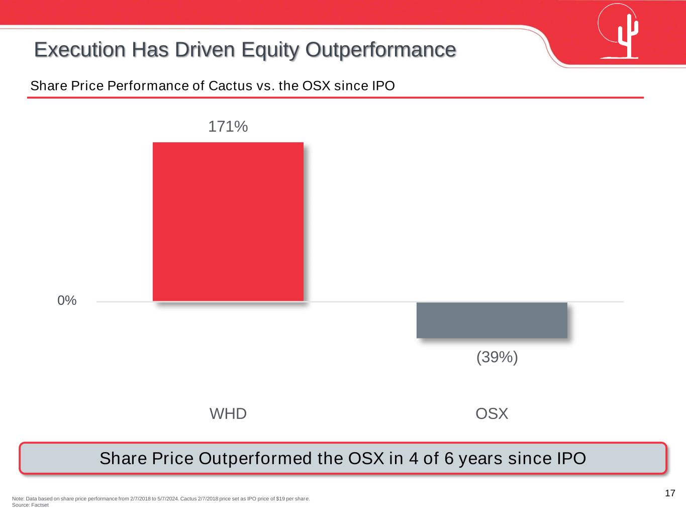 16 FTI DRQ WEIR NCSM SBO OIS HTG FET NOV 0.0% 10.0% 20.0% 30.0% 40.0% (10.0%) 0.0% 10.0% 20.0% 30.0% 40.0% Source: Company filings and Factset. Note: Adj. EBITDA Margins based on latest publicly available annual data. Cactus’ computation of Adjusted EBITDA may not be comparable to other similarly titled measures of other companies. Cactus data based on historical actuals and not pro forma for the FlexSteel acquisition. FlexSteel results included past the close of the acquisition on February 28, 2023. 1) 2023 Cactus ROCE calculation utilizes two months of year-end 2022 capitalization and ten months of year-end 2023 capitalization to reflect the acquisition of FlexSteel on February 28, 2023. The Appendix at the back of this presentation contains a reconciliation of Adjusted EBITDA to net income, the most comparable financial measure calculated in accordance with GAAP. 2) ROCE reflects average of 2017, 2018, 2019, 2020, 2021, 2022 and 2023. ROCE = (Adj. EBITDA less D&A) / (Average of the subject year and preceding year capitalization including capital leases). ChampionX ROCE data represents legacy Apergy for 2016 – 2019 and ChampionX for 2020, 2021, 2022 and 2023. 2023 Adjusted EBITDA Margin (%) ROCE(2) (2017 – 2023) (%) (1) Returns & Margins Have Outperformed Peers
